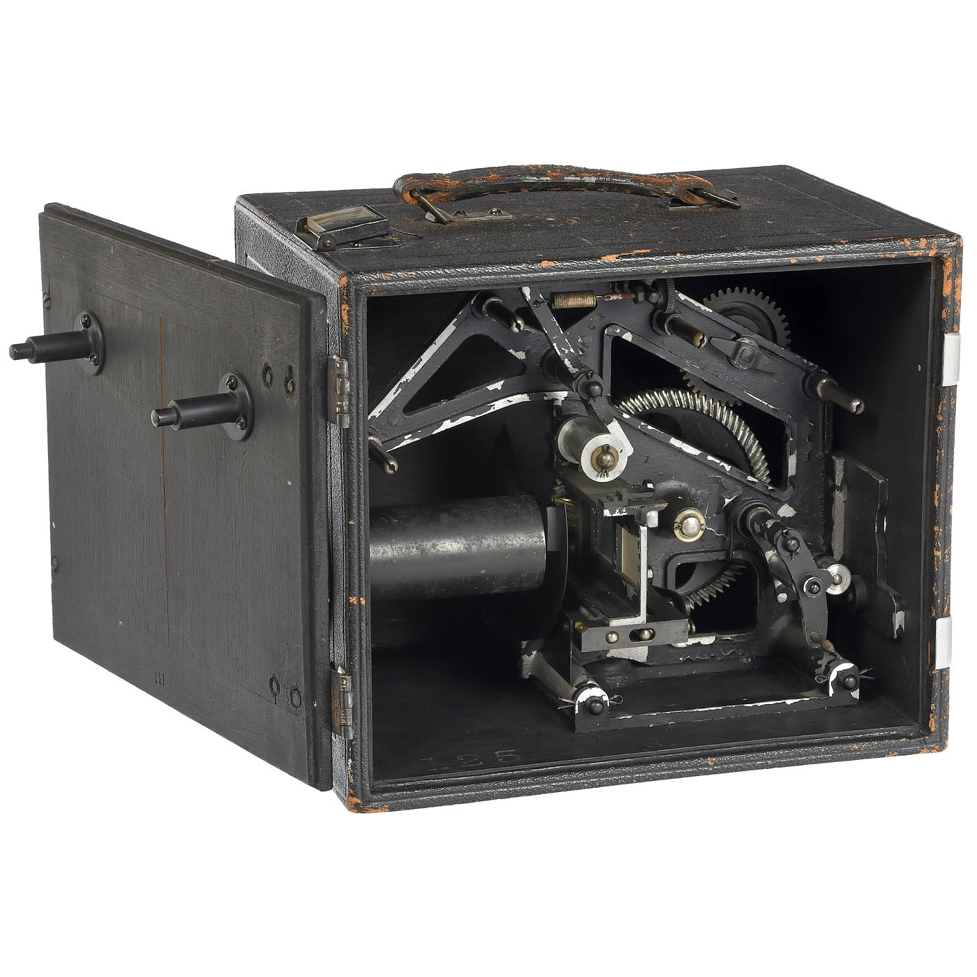 For 28mm film material in 2 metal cassettes (not included). Special feature: transport rollers without teeth and unknown transport mechanism with rotating diaphragm and beater principle. Long tube for a retractable lens (not included). Viewfinder principle: Newton viewfinder on the camera body, as a second option the entire film transport mechanism can be moved against a focusing screen (as is usual with Bell & Howell and Mitchell cameras), so that the focus and image section can be checked using a magnifying glass on the back of the camera body. On the back: meterage display for 40 m of film. Original hand crank. Tripod thread for 3/8 in. in the base. Complete mechanism in wooden case, dimensions 23 x 20 x 17.5 cm, covered with black split leather, embossed no. 125 in the case. Recording functionality not tested.