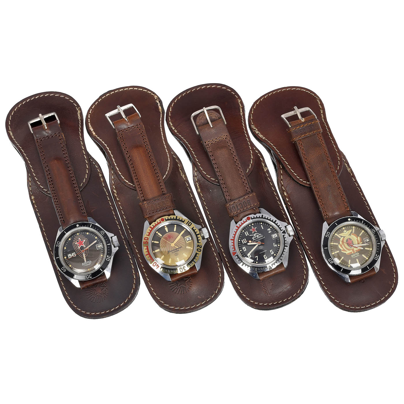 1) 4 x Vostok Komandirskie CCCP, calibre 2414, dials with different motifs, each with date, clutch winding, 17 jewels, 12-hour dial, acrylic glass, luminous hands, water-resistant, stainless steel, leather strap and case. – 2) Poljot Buran Pilot's Chronograph, caliber 3133, 23 jewels, manual winding, chronograph functions: Indication of current hours, minutes, small second hand, chronograph with central second hand, small 30-minute counter, date, stop second, black bracelet. – 3) 4 x Raketa, caliber 2628, Petrodvorez watch factory, with perpetual calendar, date and day of the week, manual winding, 3 x plastic bracelet, 1 x metal link bracelet. – 4) 4 x Vostok Komandirskie CCCP, caliber 2416B, dials with different motifs, each with date, automatic, 21 jewels, 12-hour dial, acrylic glass, luminous hands, water-resistant, stainless steel, leather strap, each with guarantee card in box. – 5) 2 x Wostok Komandirskie CCCP, caliber 2234, with date, manual winding, each in box. – And: 6) Further 11 watches, different models and motifs, each with bracelet.