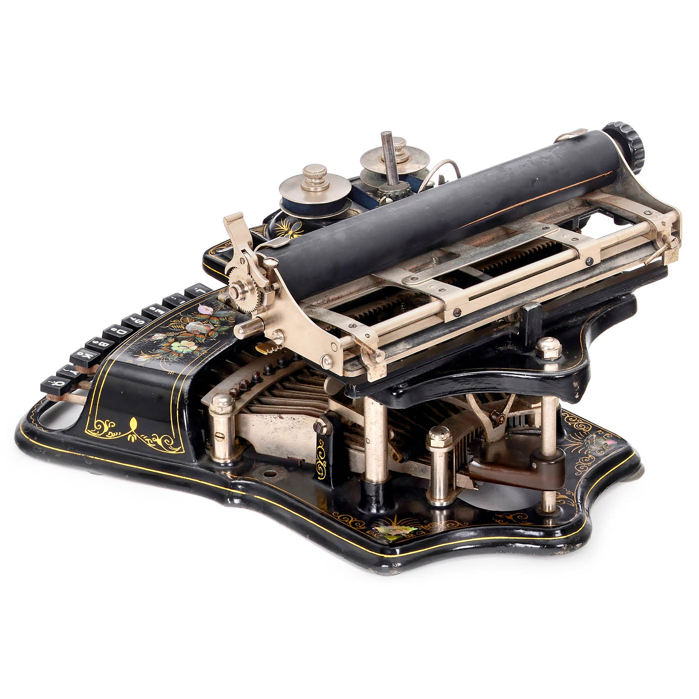 The Crandall Type Writer Co., Syracuse, N.Y. Serial no. 6467, with vertical type sleeve and curved two-row keyboard, one of the most attractive typewriters with its mother-of-pearl and gilt decoration, platen rubber torn, type sleeve does not turn, very good original optical condition. – A superb pioneer of office communication, collector's item and museum piece. – In addition: book: "American Typewriters" by Paul Lippman.