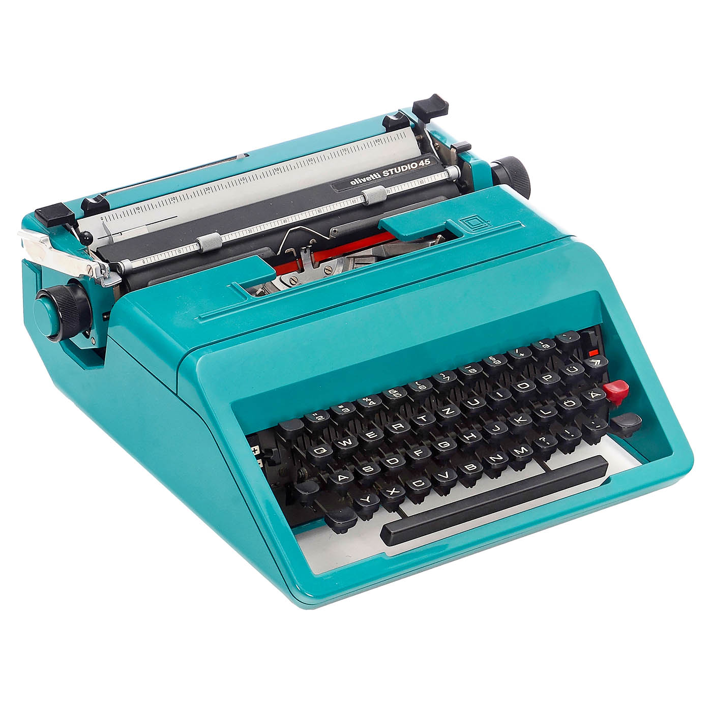 1) Monpti, 1968, Zbrojovka Brno NP in Vy?kov, Czechoslovakia, invented by industrial designer Stefan Lengyel, sold in Karstadt department stores, 4-row keyboard, double switch, rounded red plastic casing, the machine slides into the casing like a drawer, an extraordinary model designed one year before the famous Valentine. – 2) Valentine, 1969, Olivetti, Italy, legendary plastic typewriter designed by Ettore Sottsass and Perry A. King, with case. – 3) Studio 45, c. 1970, Olivetti, turquoise. – 4) Lettera 31, c. 1970, Olivetti, red. – And: 5) Dora, c. 1975, Olivetti, white. – Emblematic examples of classic industrial design!