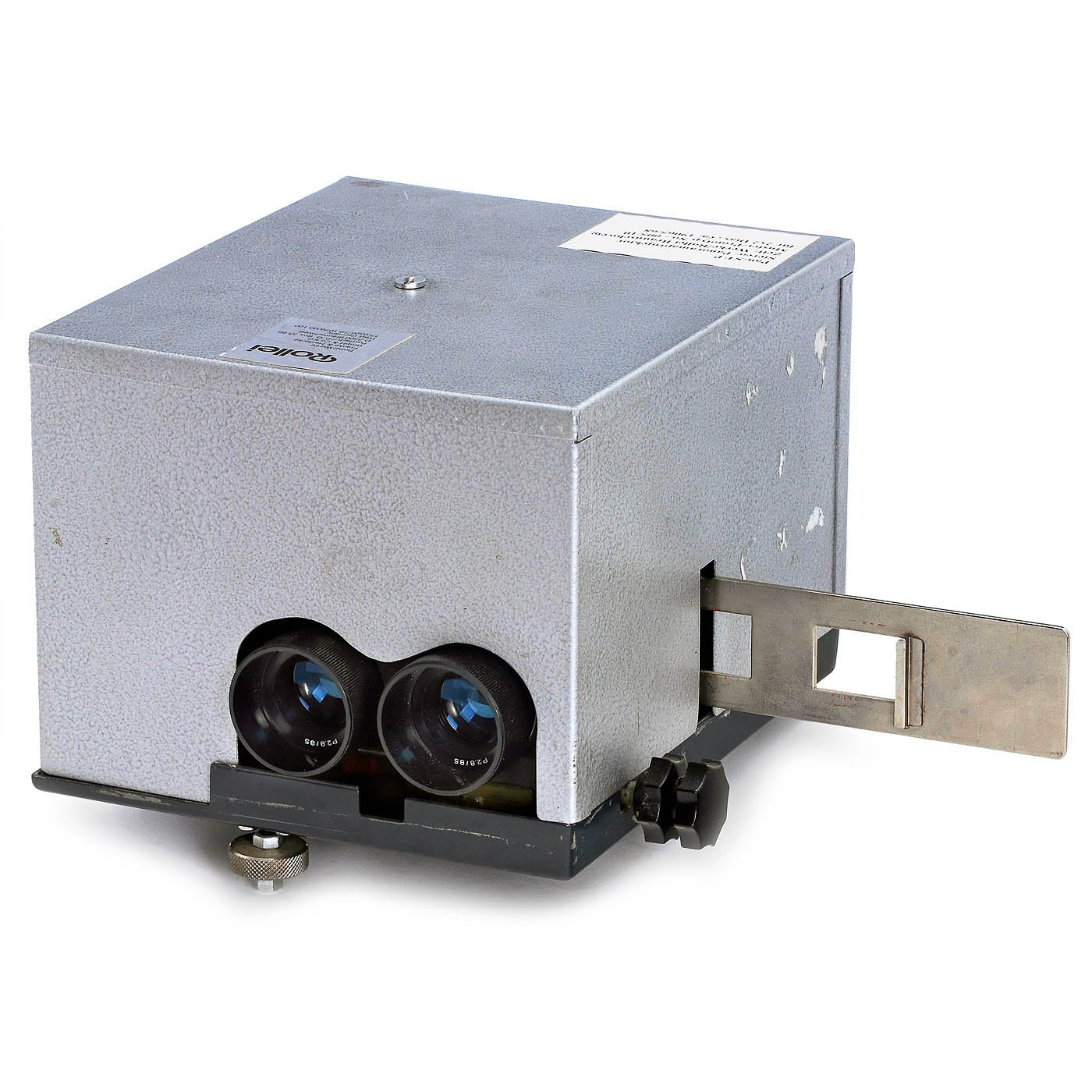 Rollei, Zett-Werke Braunschweig, Germany. According to the note, it is labeled "Pan-ST-P" for stereo projection of 35mm slides (24 x 36 mm). It features a 2.8/85 mm projection lens with a double screw on the left side, built-in polarizing filters, both lamp housings for 12 V/150 W with separate fans, and a slider for two 101 mm wide slides with a stereo format of 24 x 35 mm. All components, both inside and out, bear the craftsmanship of a prototype. Camera prototypes are rare, but a projector prototype is truly unique! Electrical functions untested.