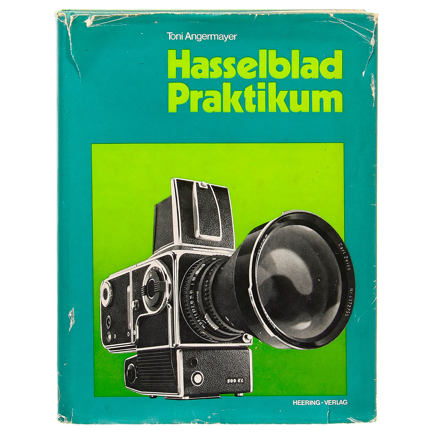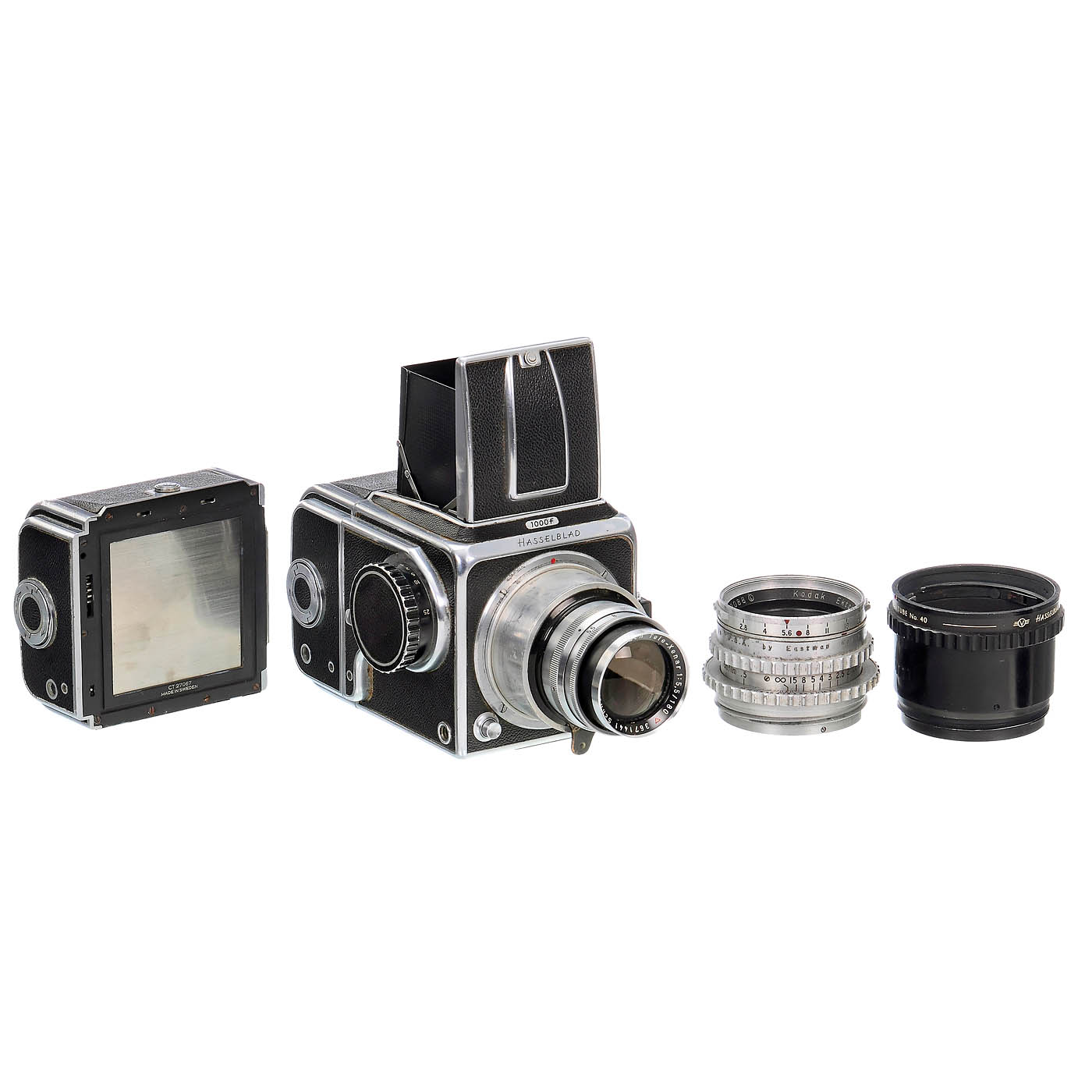 Hasselblad, Sweden/Schneider, Kreuznach. 1) Hasselblad 1000F no. CT 20469 with Schneider Tele-Xenar 5.5/180 mm no. 3671441 with focusing worm, lens good to clean under point light, with 6 x 6 magazine no. CT27067, synchronizing shoe and extension ring no. 40. (3/3) – 2) Kodak Ektar 2.8/80 mm, glass with damage to rear lens, and magazine 6 x 6 no. CP 15719. (4/3–4) – And: 3) Book "Hasselblad Praktikum" by Toni Angermayer, 1977. – Note: Hasselblad had good experiences years prior with Tele-Xenar lenses for the HK7 aerial camera of 1941 in 7 x 9 cm format.