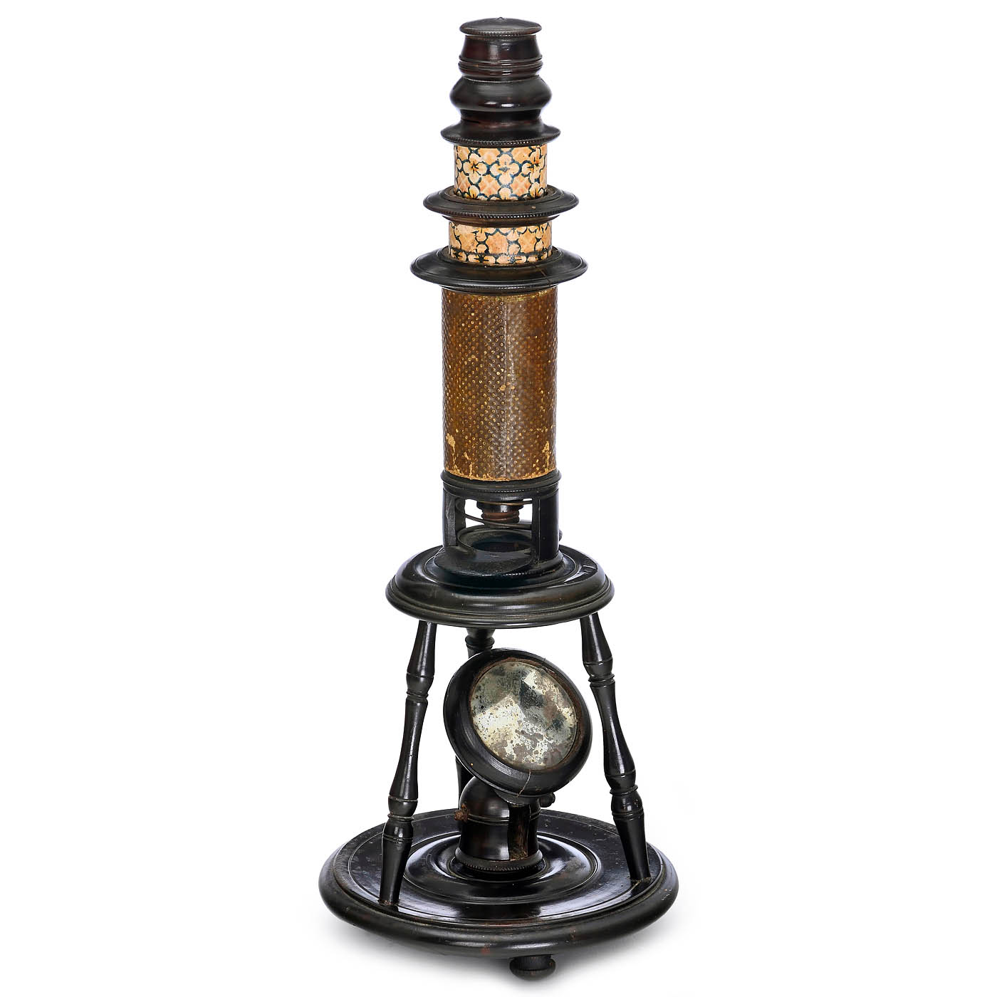 Fruit wood, paper and cardboard; original condition; height 12 ? in., 1 eyepiece (with dust cover), 1 objective lens, Bonanni spring stage; coarse and fine adjustment by moving the paper-covered tube (some paper loss on the inner tube), typical brand mark under the base "JFF" (in a heart), the mirror is slightly blind; functional, low magnification as is usual for this type of microscope; under glass cover.