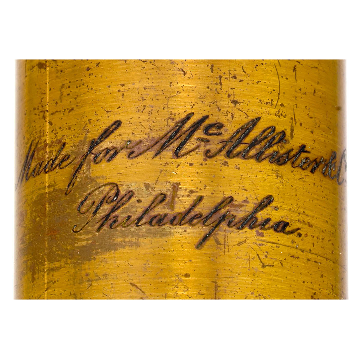 Attributed to the Parisian optician No?l Fran?ois Joseph Buron, signature on tube "Made for McAllister Co. Philadelphia", original lacquered brass, height when mounted on the box 14 in., box dimensions 10 ? x 6 x 3?? in., 1 lens, 1 eyepiece, substage pinhole aperture disc, mirror added, coarse and fine adjustment via a rack and pinion drive, mahogany box with a plaque reading "Presented to James Rodgers DD by the youth of his Congregation March 1856", drawer with removable tray.