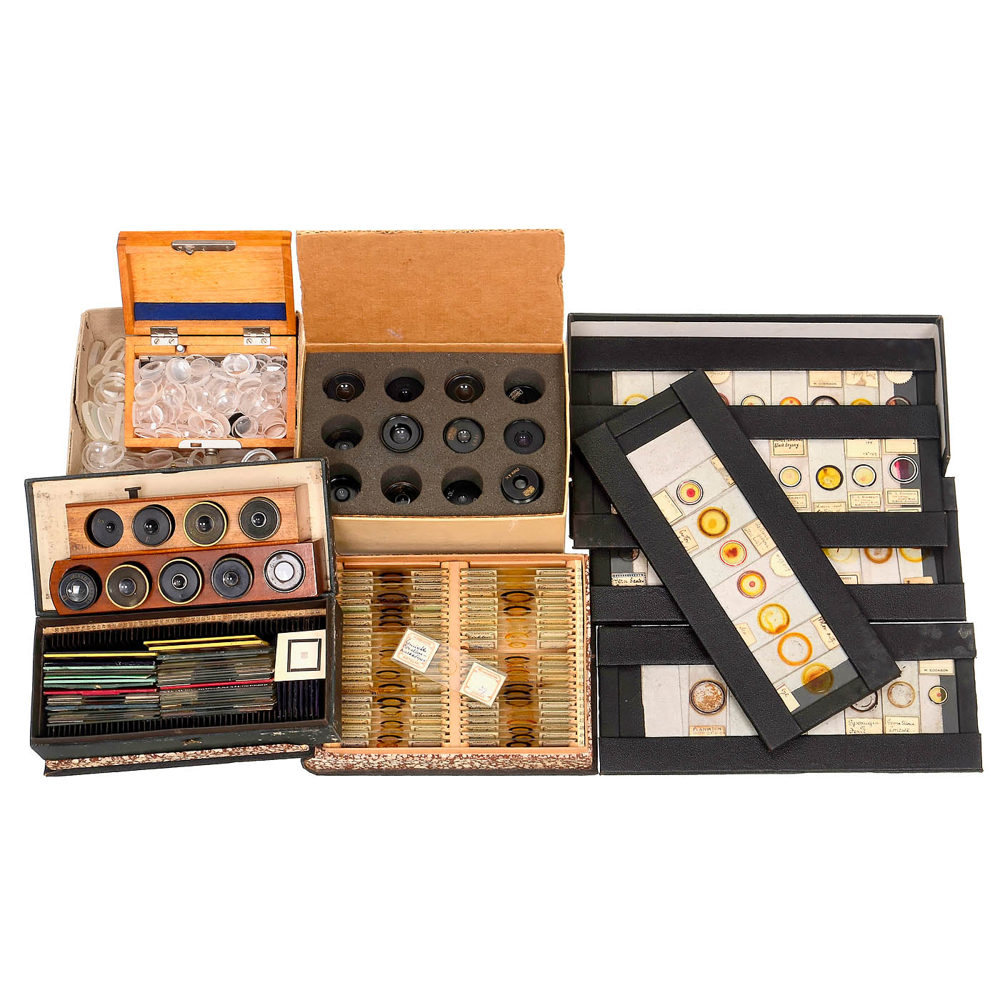 1) Microphotograph "Gentle Warning" by William Overend Geller (W.O.G.), c. 1855, glass on the right side broken, photograph undamaged. – 2) 35 early preparations, loose in cardboard box. – 3) Cardboard box with 5 trays, England, with 37 slides by "W.A. Rogerson" and others. – 4) Cardboard box in book form, c. 1900, containing 49 microscopic specimens by "Heinrich Boecker from Wetzlar". – 5) 50 recent microscopic specimens in plastic box. – 6) 25 eyepieces from Zeiss and other manufacturers. – 7) Approx. 300 lens blanks, various shapes and diameters. – 8) Lens Emil Busch Glyptar Anastigmat 3.5/3.5 cm. – 9) Approx. 50 objective lenses, mostly brass-framed, c. 1875–1920. – And: 10) Many more parts: Stage clamps, case keys, revolver nosepieces, mirrors, glasses, prisms and other.