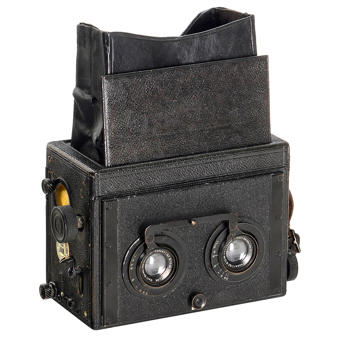 Goltz & Breutmann, Dresden. No. 22284, for 45 x 107 mm, Zeiss Tessar 4.5/7.5 cm nos. 160773 and 160767, standard height-adjustable, second curtain focal-plane shutter remains half open, a small crack in the viewfinder, with focusing screen back and 3 double film holders. Rare stereo reflex camera, manufactured for only a few years.