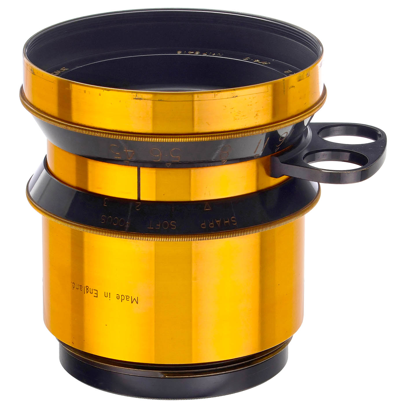 Fallowfield, England. Mahogany with brass fittings, special model with cloth holder incorporating a viewing slit for checking the exposure. Sliding front standard with hinged light-shielding hood of the same mahogany, featuring a holder for effect lenses at the very front. Equipped with a Taylor-Hobson Cooke Portrait Anastigmat Series IIB 4.5/12 ? inch lens, no. 178415, smooth soft-focus and aperture adjustments. Glass under point light: minimal age-related deposits between the front elements, otherwise clean. Dimensions: 36 x 30 x 37 cm (68 cm with hood). Black leather bellows with some tears along the edges. The back of the camera swivels on two axes, with a quick-change slide, removable reducing inserts in the back from a maximum of 22 x 22 cm down to 7 x 16 cm, plus two matching studio cassettes for 19.3 x 24.4 cm and 21.8 x 16.7 cm respectively, both with reducers for 21.7 x 16.7 cm and 16.6 x 12.2 cm. A well-preserved and striking studio camera that inspires photography.