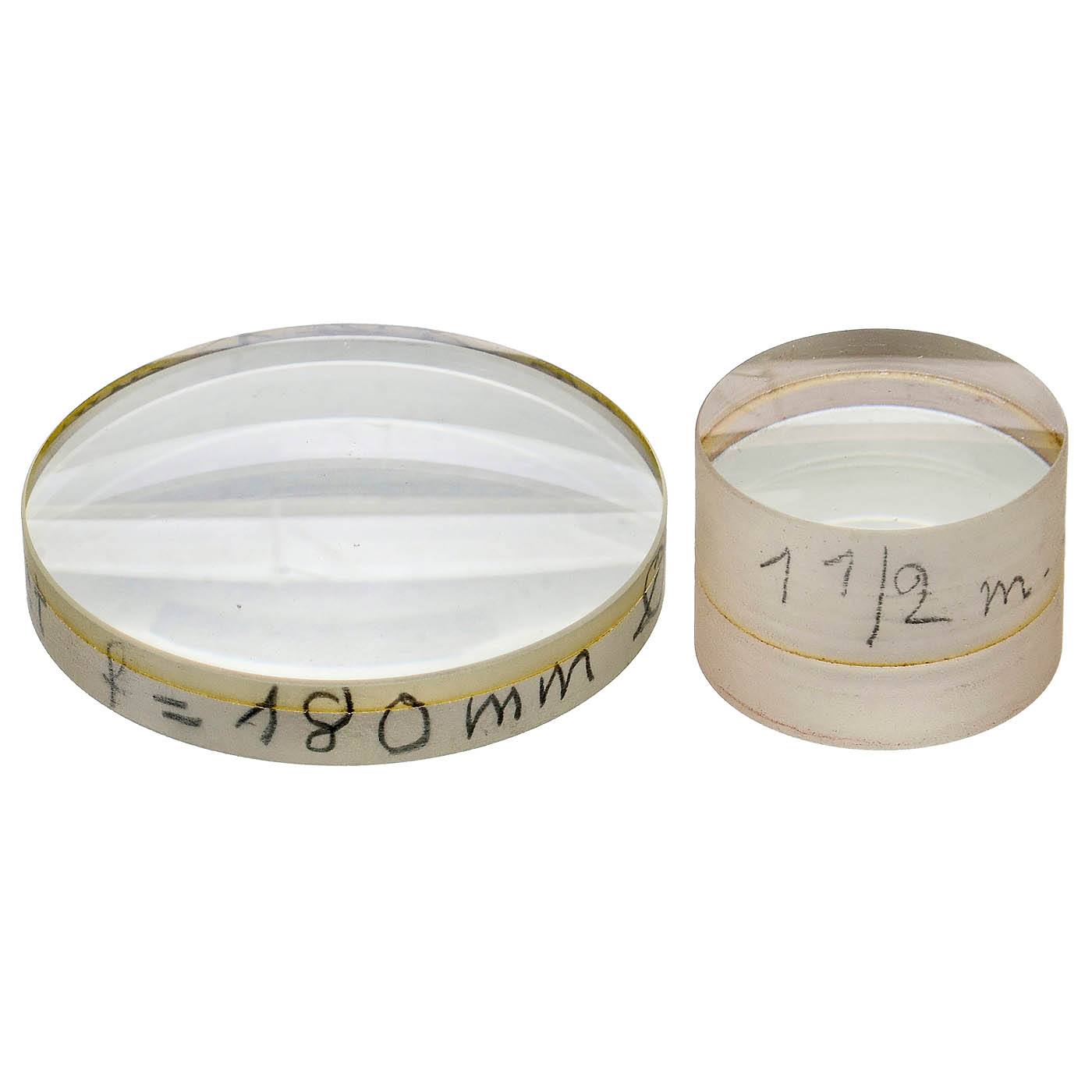 1) Steinheil in Munich. A very rare Steinheil lens in an aluminum mount. Lens no. 36862, aperture range: 1/2–8, lens height with lens hood only 35 mm, with a 50 mm diameter screw-on ring, lenses quite clean. – Note: In order to make lenses lighter, the much lighter material aluminum was used instead of brass in the 1880s. This was only for a very short time, however, as aluminum was three times more expensive to produce than brass at the time. Sales of such lenses were so low that brass was used again. – In addition: Unmarked brass landscape lens, c. 1870–80, for plug-in apertures. Lens height 65 mm, glass fairly clean. – And: 2) lens elements, presumably by Steinheil: a) Cemented double lens, marked in lead: 1 1/2 m, diameter 26 mm, height 19 mm; b) Cemented double lens, marked in lead: 1:4 f=180 mm, diameter 45 mm, height 8 mm.