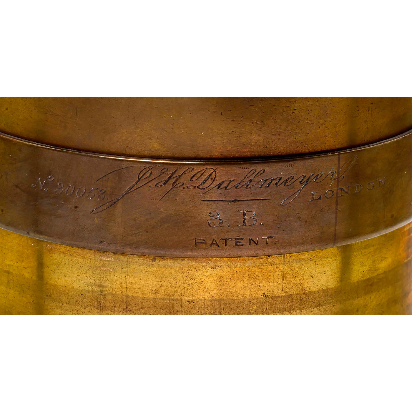 J.H. Dallmeyer, London. No. 30053, focal length approx. 11 in., brass, for Waterhouse stops (with No. 5 for stop 16), height 8 in., front element ? 8.9 cm, rear element with smoothly moving soft-focus adjustment, glass clean under point light, all lens parts movable, lens hood with some very minor dents, with cap and mounting ring. – Note: An interesting feature is the rotating rear-element mount, through which the spherical aberration can be influenced and a "soft-focus" effect achieved. – A sought-after portrait lens.