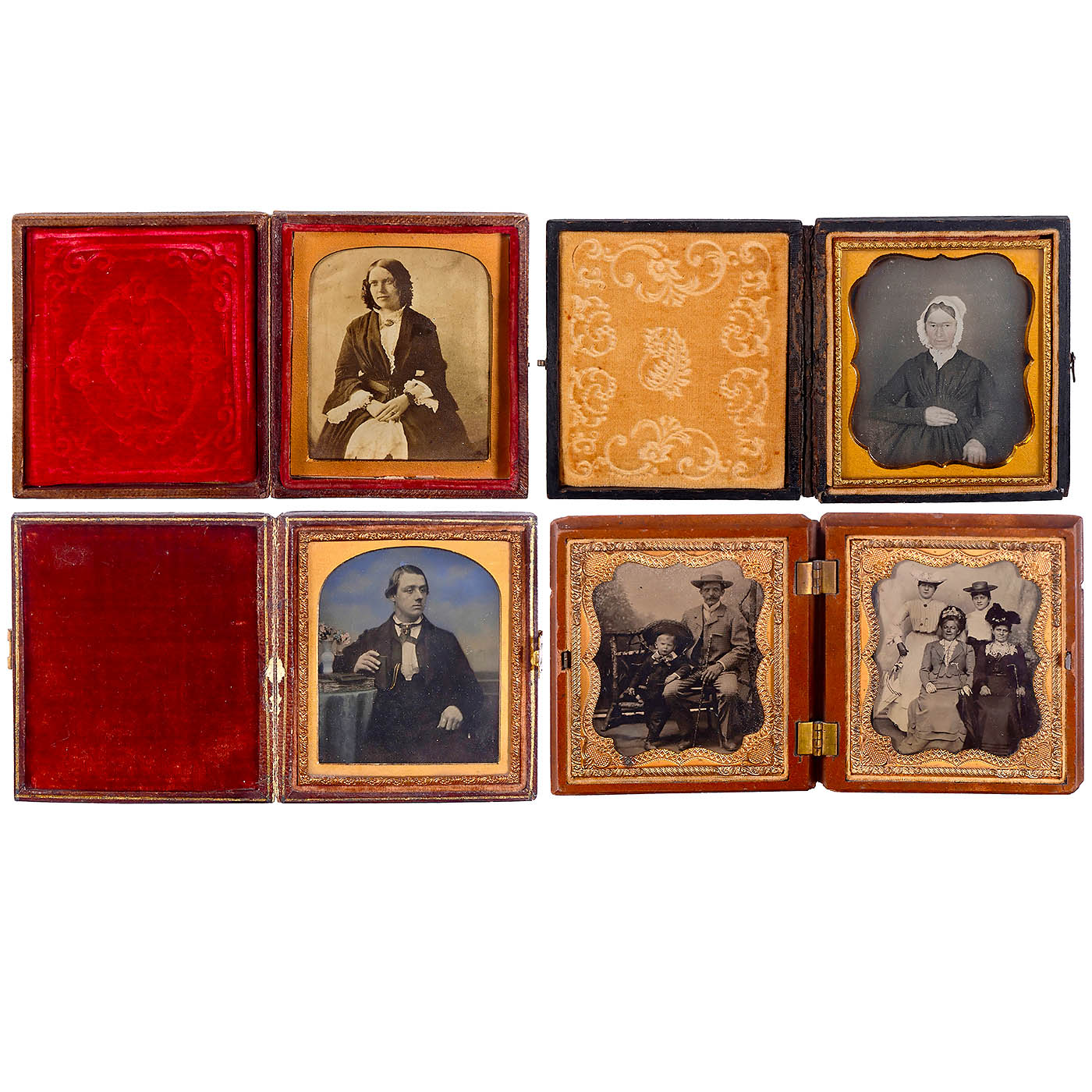 1) American daguerreotype, c. 1855. Anonymous, 1/9 plate in case, female portrait, face lightly colored, brass mount, case glued to the spine. (2–3/–) – 2) Professionally hand-colored ambrotype, c. 1850–60. Anonymous, 1/9 plate. Portrait of a gentleman, hand-colored and additionally gold-toned, brass mount, original case. Excellent professional work! (2/–) – 3) Union case with two tintypes, 1856 onwards. Anonymous, dimensions 6.5 x 8 cm each, presumably from the USA. Case labeled: "Genuine Union Case – S. Pack's Patent, 1854–1856". Union Case was the first process for producing plastic (bakelite). (3/–) – And: 4) Case with salted paper photograph, c. 1845–50. Anonymous, 6.5 x 8 cm, mounted on cardboard, portrait of a woman. The clasp on the case is missing. (3/–)