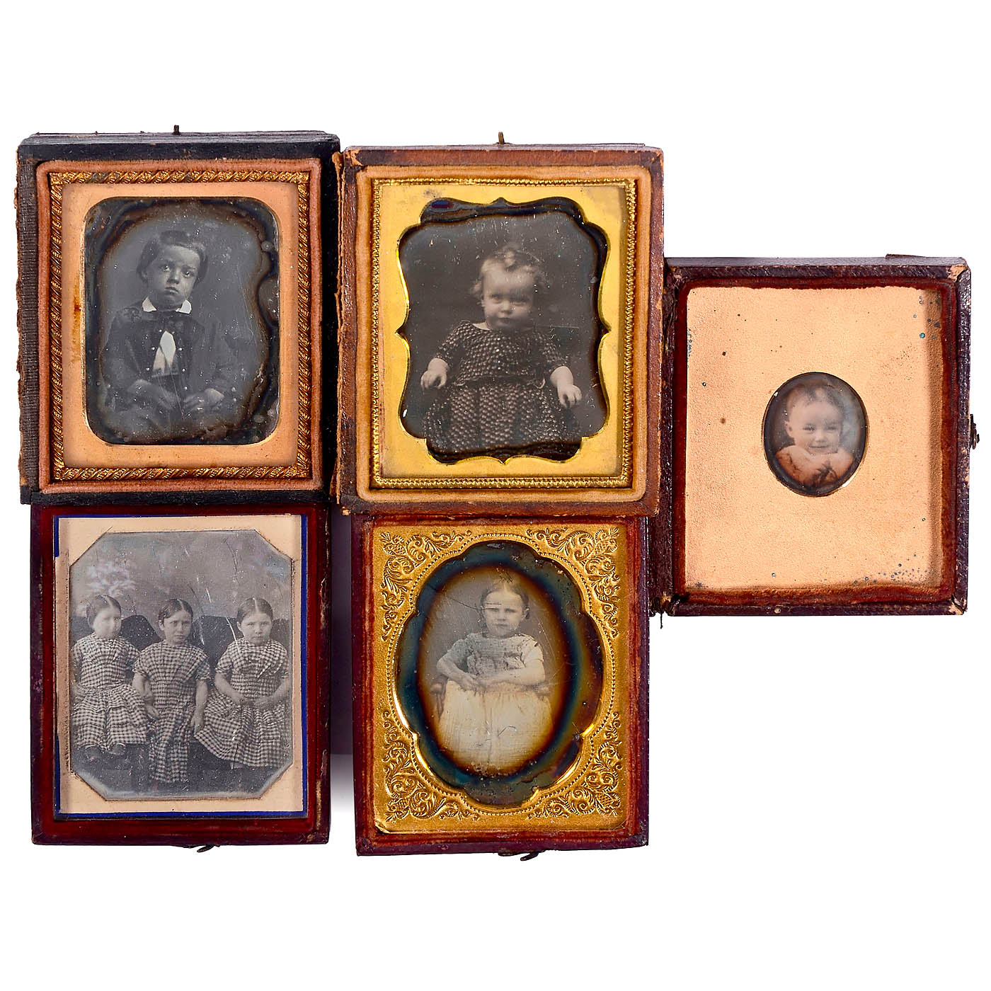 In 5 hinged cases (6 x 7.2 cm), these daguerreotypes range in size from 25 x 21 mm to 45 x 56 mm. The lids of two of the cases are loose. The smallest portrait depicts the youngest child and is beautifully hand-colored. In the second image, a girl of about 5 years old is holding probably a Biedermeier-style cloth doll very lovingly in both hands. The third image shows a little boy, the fourth a girl of about 3 years old with her gaze focused on the camera, and the fifth image likely depicts triplets wearing identical dresses. Very charming images of a very rare genre!