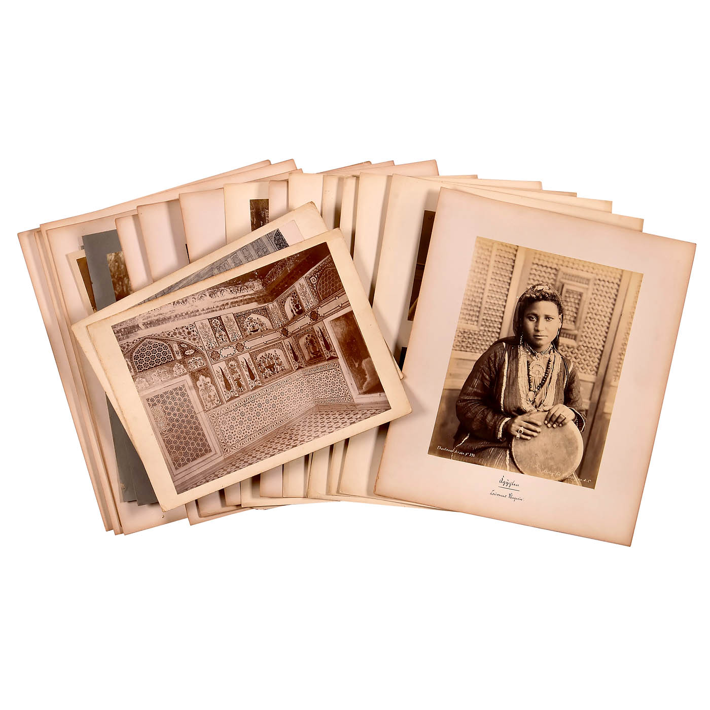 34 titled photographs of Egypt depicting its buildings, streets, squares, mosques, and inhabitants, all mounted on card stock ranging from 43 x 33 to 33 x 24 cm, in good condition. The set includes 6 photographs by Sebah, 3 by Bonfils, 4 by Zangaki, 1 by Beato, 1 by Lekegian, and 13 photographs without photographer attribution or with names that are difficult to read. Also included are 6 interesting ethnographic plates, each containing 4 images, including 11 images by Sebah.