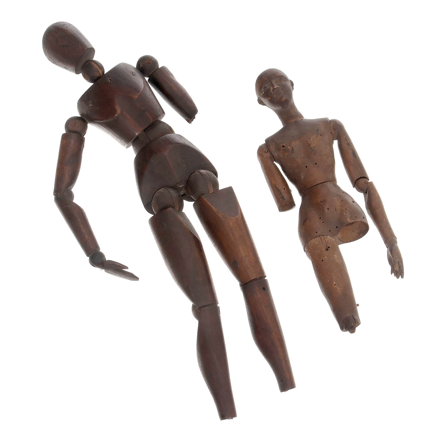 1) Pleasing porcelain figure c. 1900 of a youthful monk in a habit carrying a heavy load of fresh fruit and vegetables on his back. Removing the lid reveals a motif similar to Giovanni Boccaccio's Decameron. Height 26 cm. (2-/3) – 2) Extremely rare oak figure of a young monk, approx. 10 cm high. Pulling the cord reveals the fundamental problem of the clergy. Completely preserved. (3/3) – 3) Probably late medieval, wooden figure of an old monk with two flaps for the front and back. Contents missing. – 4) Naive folk art wood carving c. 1850 with a side-opening base. Completely preserved. (3-/3) – And: 5–6) Two artist's anatomy models, 25 cm and 36 cm high, suitable for this theme, as their missing body parts indicate misuse. (4/–) – Interesting exhibition material. – Provenance: From the Ronny van de Velde Collection.