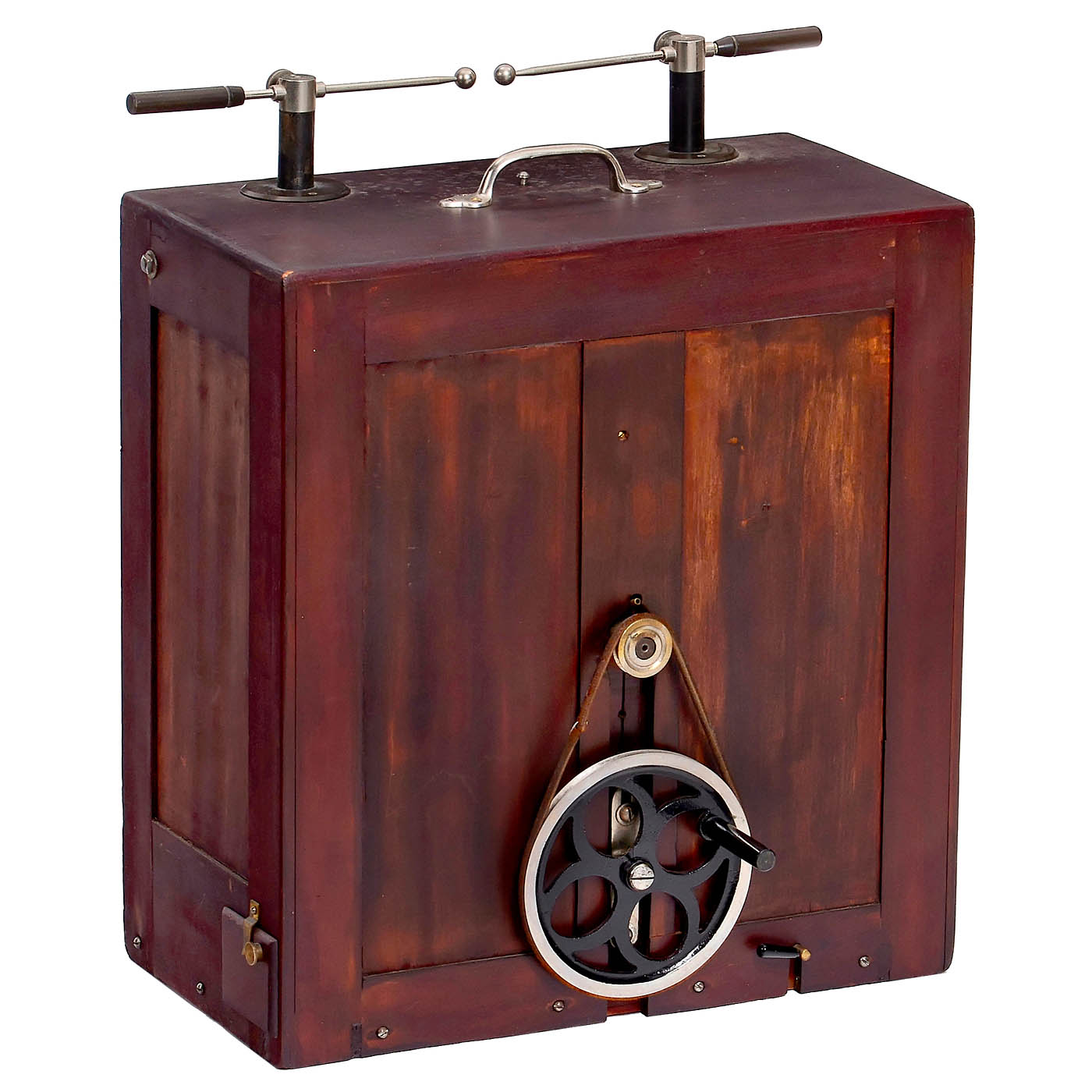 Large influence machine after Holtz, consisting of a fixed glass plate and a rotating glass disc, diameter 15 in., hand crank drive on the rear, 2 Leyden jars, in wooden case with glass front, dimensions 20 x 10 ? x 21 2/3 in.