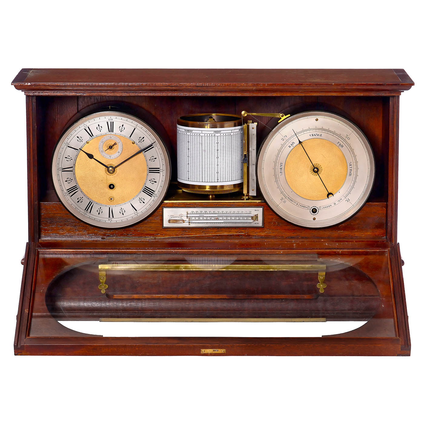 London, oak case, with mechanical clock, 8-day brass plate movement, pendulum, Roman numerals, subsidiary seconds, ? 8 in., eight-day fusee movement which is mechanically linked to a revolving drum that records the fluctuations in the barometric pressure, right side with aneroid barometer, coupled with the recording drum, in the center is an alcohol thermometer that displays the maximum and minimum temperatures, case dimensions 26 x 8 x 15 ? in. – With two keys.