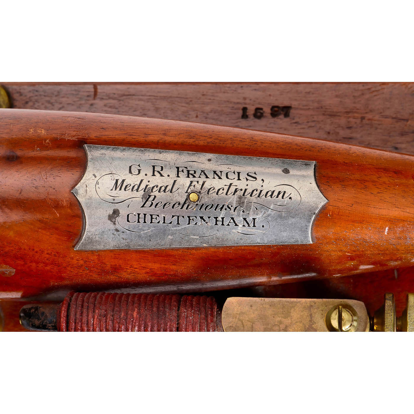Marked "G.R. Francis, Medical Electrician, Beachhouse, Cheltenham", no. 1597, with coil in conical mahogany housing with adjustable iron rod core, mounted on mahogany base with horseshoe magnet, contact breaker and lacquered brass connections, 11 x 5 in.