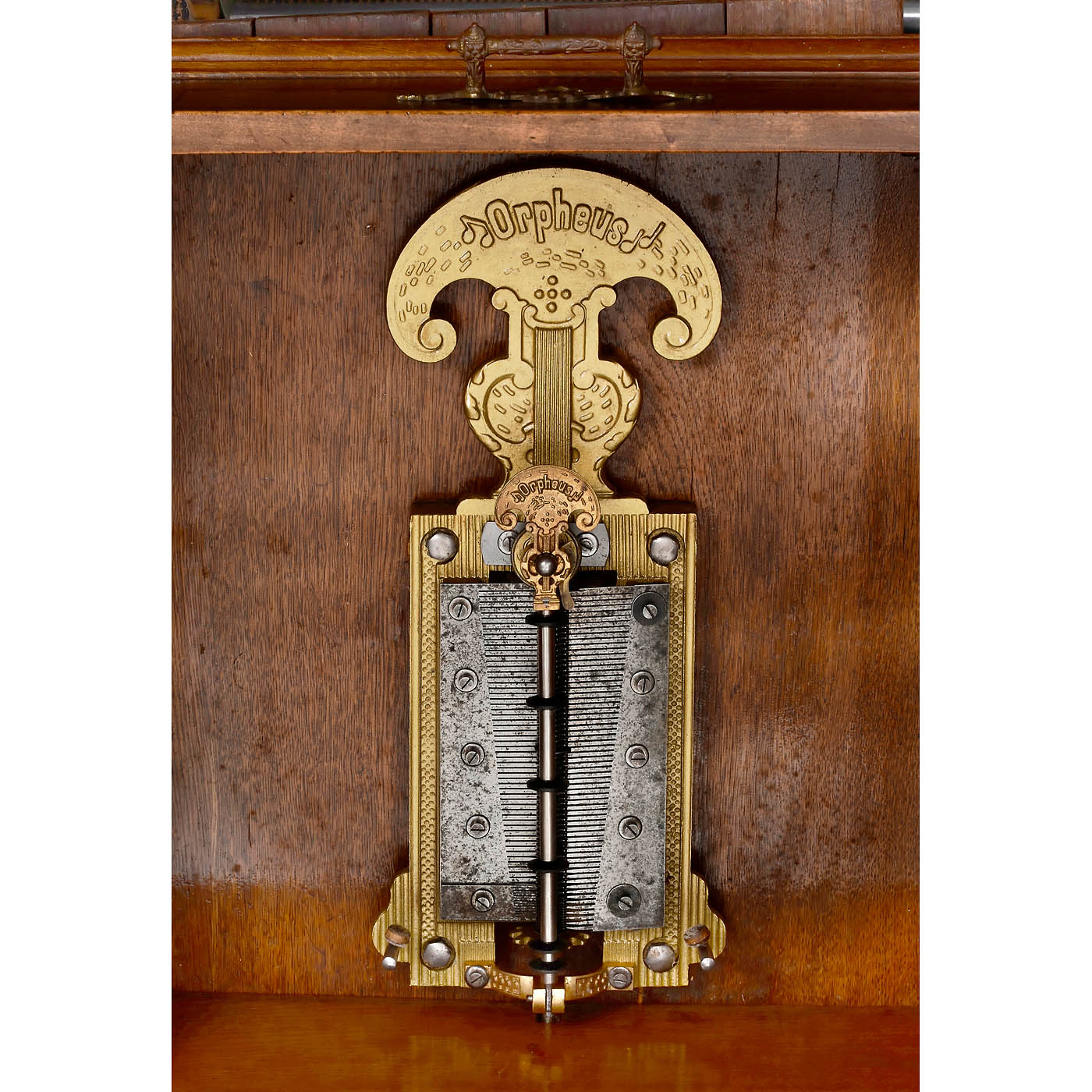 Musikwerke Orpheus Ludwig & Co., Leipzig. For 18 ? in. discs, 128 teeth in double steel comb (complete), treble notes with additional comb and narrow star wheels for a bell-like sound, visible spring motor, colorful underlid lithograph depicting Neptune, walnut case (split in lid), bronze handles, new crank, dampers in need of minor regulation, otherwise in good playing condition, with 5 discs.