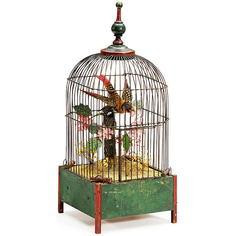 With cylinder musical movement for 2 tunes ("Carmen"), wooden case with wire cage, height: 15 ½ in., the bird swings with his wings while the music is playing – great working condition!