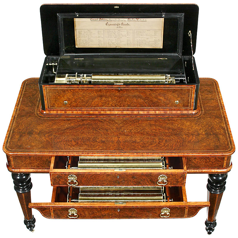manuscript tune-sheet headed "Conrad Felsing, Königl. Dof Uhrmacher, Berlin, W.", on matching table with two storage drawers and faceted hexagonal legs, table 46 ½ (118 cm) wide, cylinders 16 1/8 x 3 in. diameter (41 x 7.7 cm).