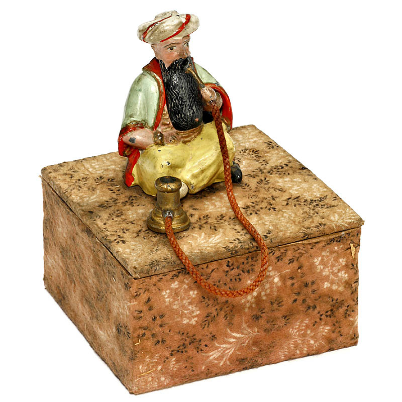 The painted metal figure sitting cross-legged on fabric-covered wood base with open-spring motor that causes him to raise and lower the pipe, as a piston in the base draws smoke from the hookah pipe and expels it from his mouth, height 6 ¼ in. (16 cm). Overall good condition with traces of age. – Literature: Illustrated in: David Pressland, "Art of the Tin Toy", 1995, p. 81. – Described in: Mary Hillier, "Automata and Mechanical Toys", 1976, pp. 158–159. – Extremely rare!