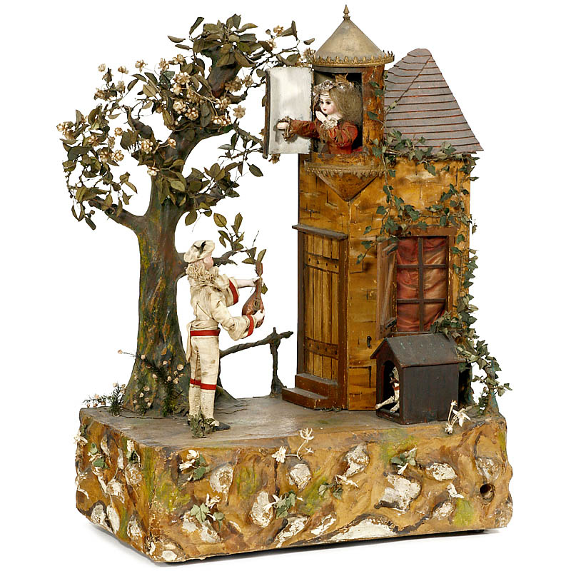 Depicting a painted card house with turreted tin room, kennel and garden in which a boy stands playing a mandoline, on sculpted papier-mâché-over-wood base containing single-air going-barrel movement and bellows that cause the boy to strum and nod his head, a window in the turret to open revealing a French bisque-headed lady who leans from the casement and throws kisses, while a dog emerges from the kennel, opens his mouth and 'barks', height 21 ½ x width 16 in. (55 cm x 40.5 cm), boy height 7 ¾ in. (20 cm) with Roullet & Decamps stop/start (boy's left thumb repaired). Good working condition.