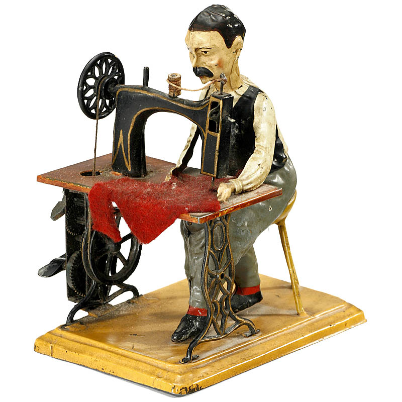 Manufactured by: "Siegfried Günthermann", Nuremberg, height: 6 ½ in., hand-painted tin, rare clockwork version and even because of the rarer male figure.