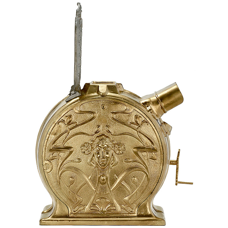 Exceptionally rare table model of early Berlin production, with wonderful decorative art-nouveau motif on both sides. Probably from the very first and only prototype series as nearly nowhere else known. With original Mutoscope reel "The rival in love". Marquee sign probably later. – A fascinating rare collector's item and museum piece!