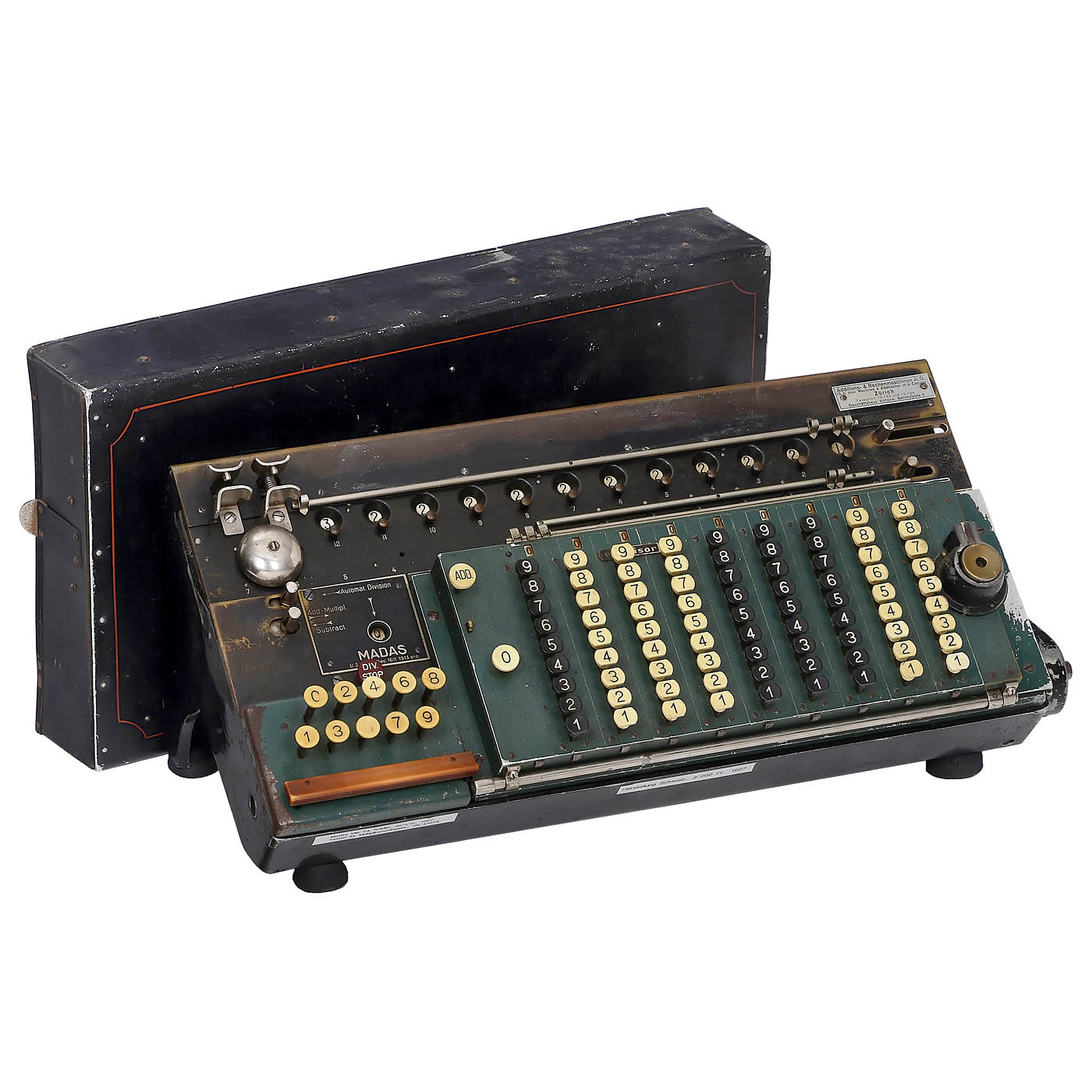 Very interesting Swiss stepped-drum calculating machine with keyboard setting according to US patent from Dec. 16, 1913, manufactured by H.W. Egli A.G., Zürich. For the 4 basic arithmetic operations including automatic division. 9-digit setting keys, 7-digit revolving register and 12-digit result register, electric motor drive (untested), serial no. 41074. – Literature: Martin, p. 208. – With tin cover.