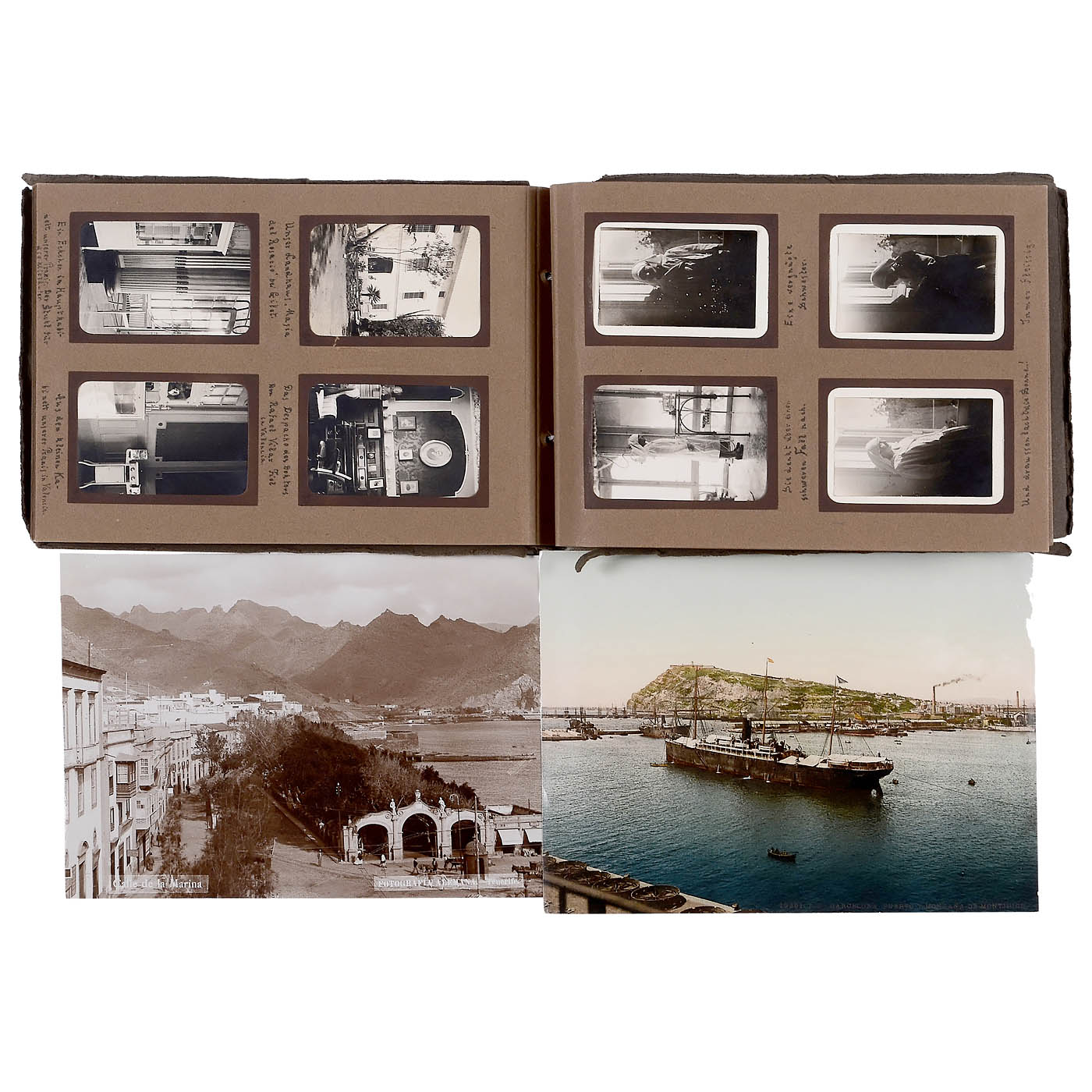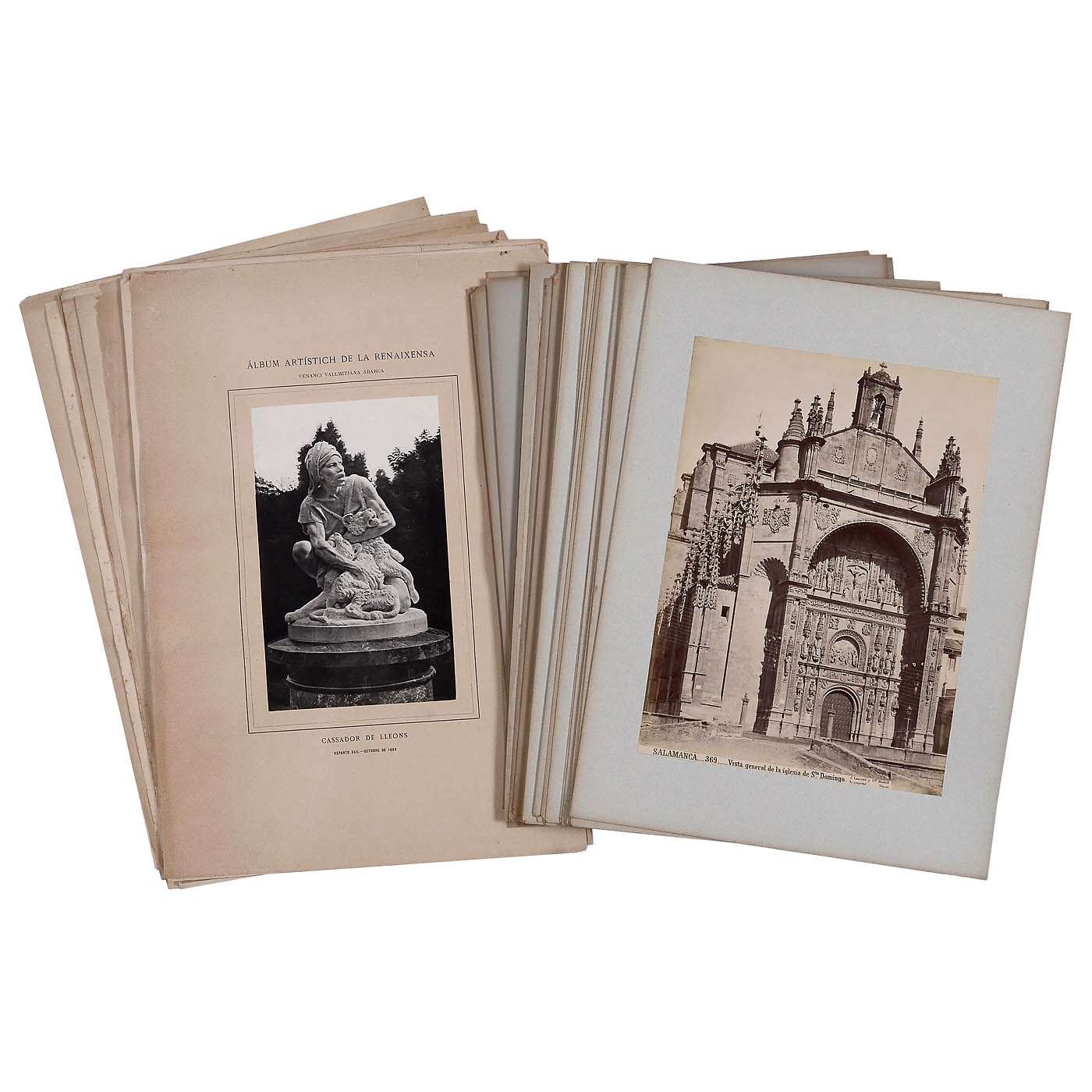 1) 45 early albumen prints (25 x 33 cm) on mostly light green cardboard (34 x 46 cm), photographs by Laurent (Madrid) and E. Beauchy with views of Barcelona, Burgos, Salamanca (18 x), Seville (13 x), Toledo, and other places. – 2) Album from 1926–1927 of Valencia by a German doctor practicing there, 48 photos (6 x 9 cm). – 3) Album "Artistiche de la Renaixensa", 12 sheets (50 x 35 cm). – And: 4) In 18 x 24 cm: photochrome (hand-colored) of Barcelona and an albumen print of Tenerife.