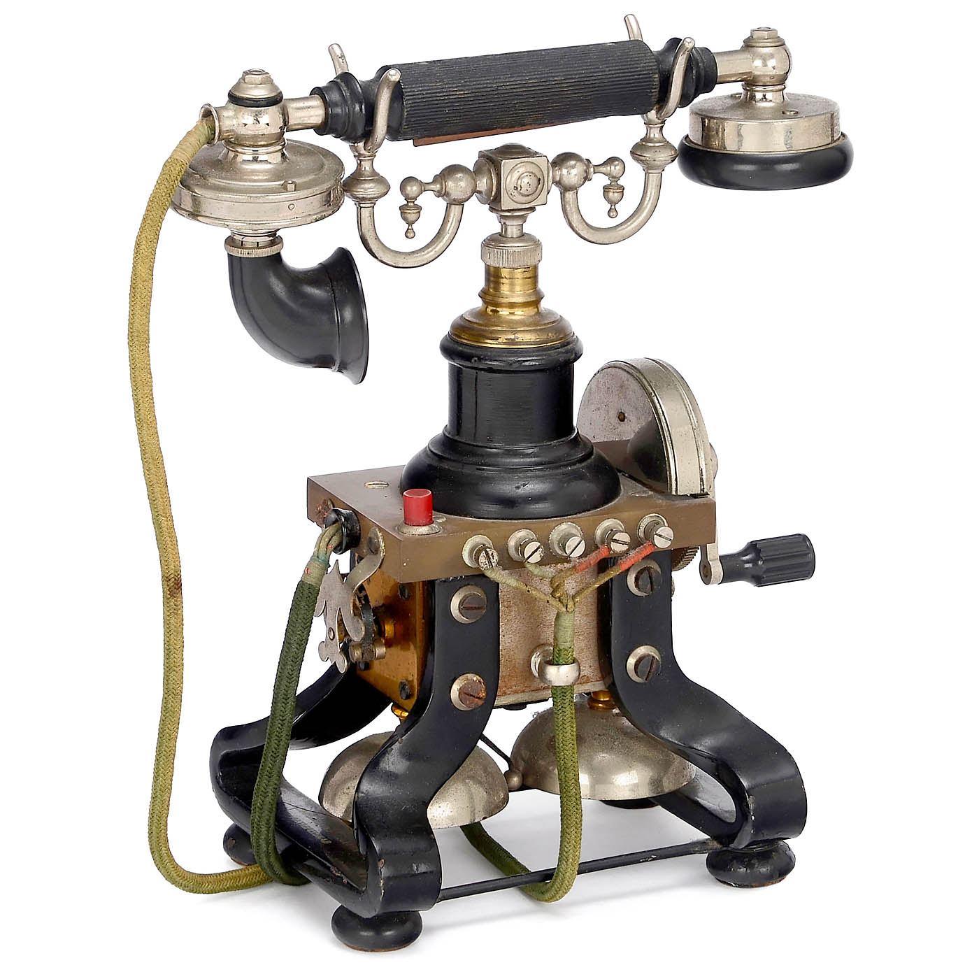 L.M. Ericsson, Stockholm. Marked "Kjobenhavns Telefon Aktieselskab", handset with speaking horn, centrifugal governor, ebonite plate, 4-pole fabric cable, wall-mounted connection disk, complete. – Desirable collector's item!