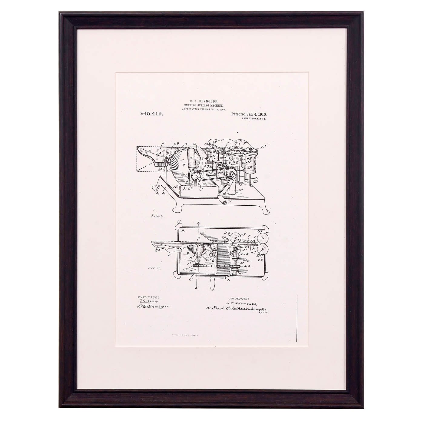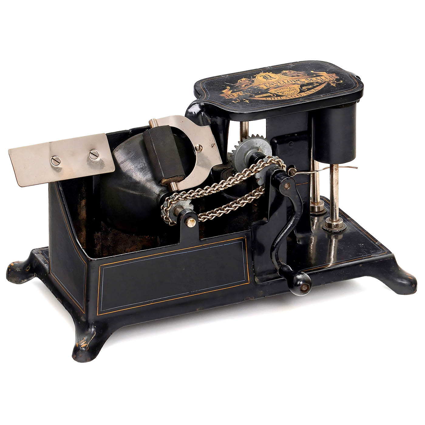 Manufactured by C.H. Reynolds, Chicago, IL. Black lacquered cast iron, nice golden decoration, handcranked, working, with framed copy of the patent drawing from 1910.