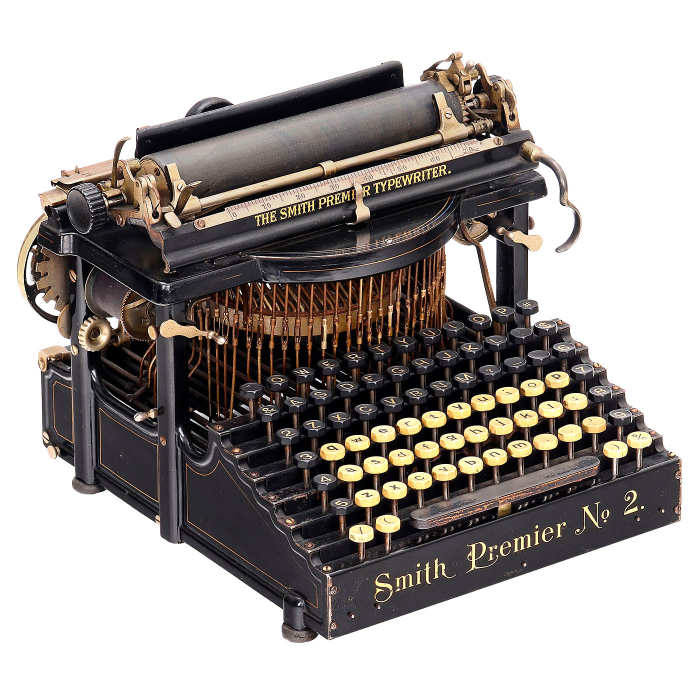 1) "Remington Standard No. 7", c. 1899, serial no. 44927, upstroke machine, with German retailer's label, working. (3/3) – 2) "Smith Premier No. 2", c. 1895, serial no. 1016, upstroke machine, space key defective, otherwise operational. (3/4) – 3) "Hammond No. 2", c. 1905. Typewriter with curved ideal keyboard and rear hammer strike, with oak cover and base, no. 60532, fine-mesh paper drum, with backspace key, two broken keycaps, various other defects. (3/4-) – And: 4) Franklin No. 7, 1901, serial no. 13893, type IVb, rare example of the decorative American frontstroke typewriter with round Ideal keyboard, 40 keys in three rows, "Franklin" in script on the shield, ribbon spools above the carriage, working condition. – Literature: Martin, 1949, p. 95. (4/3)
