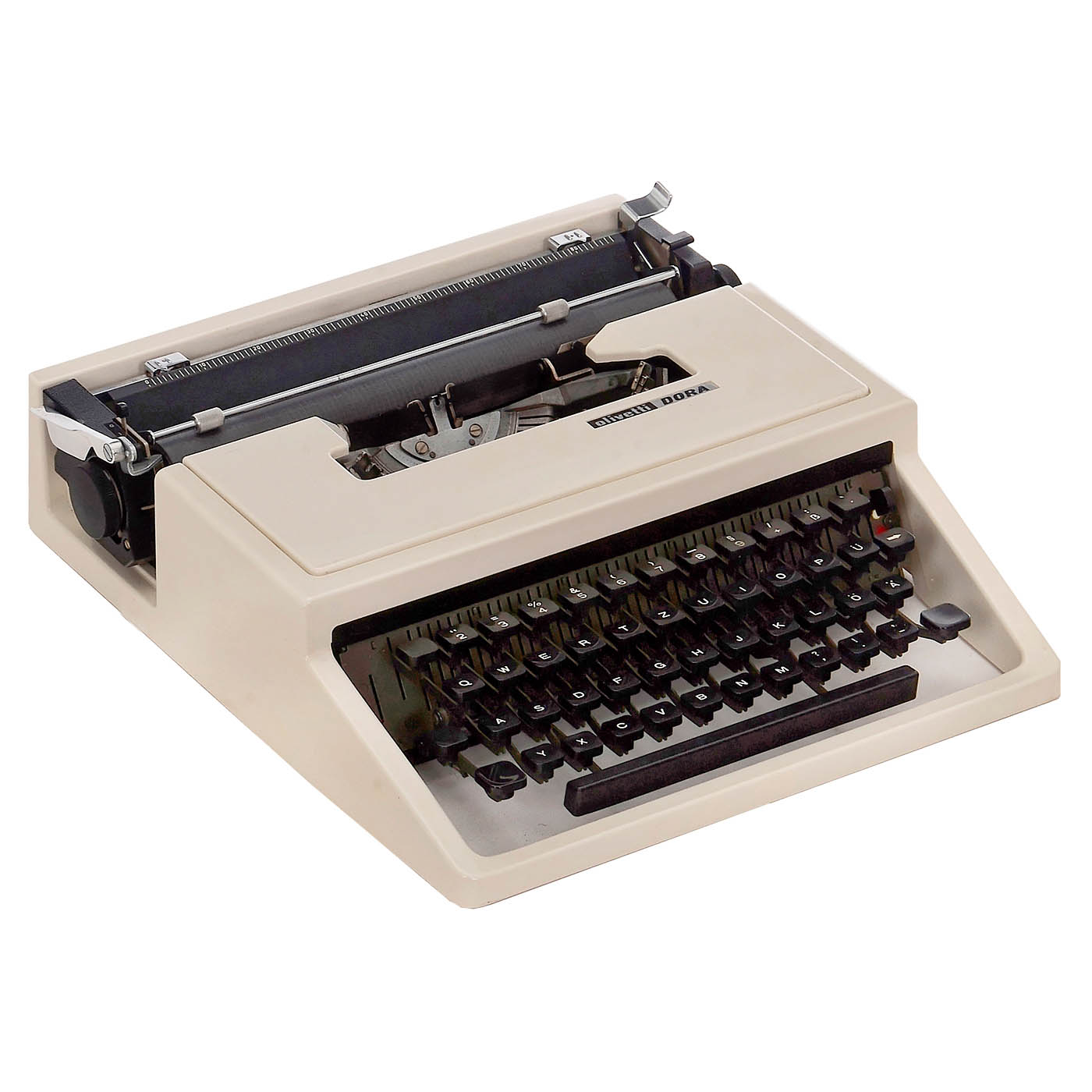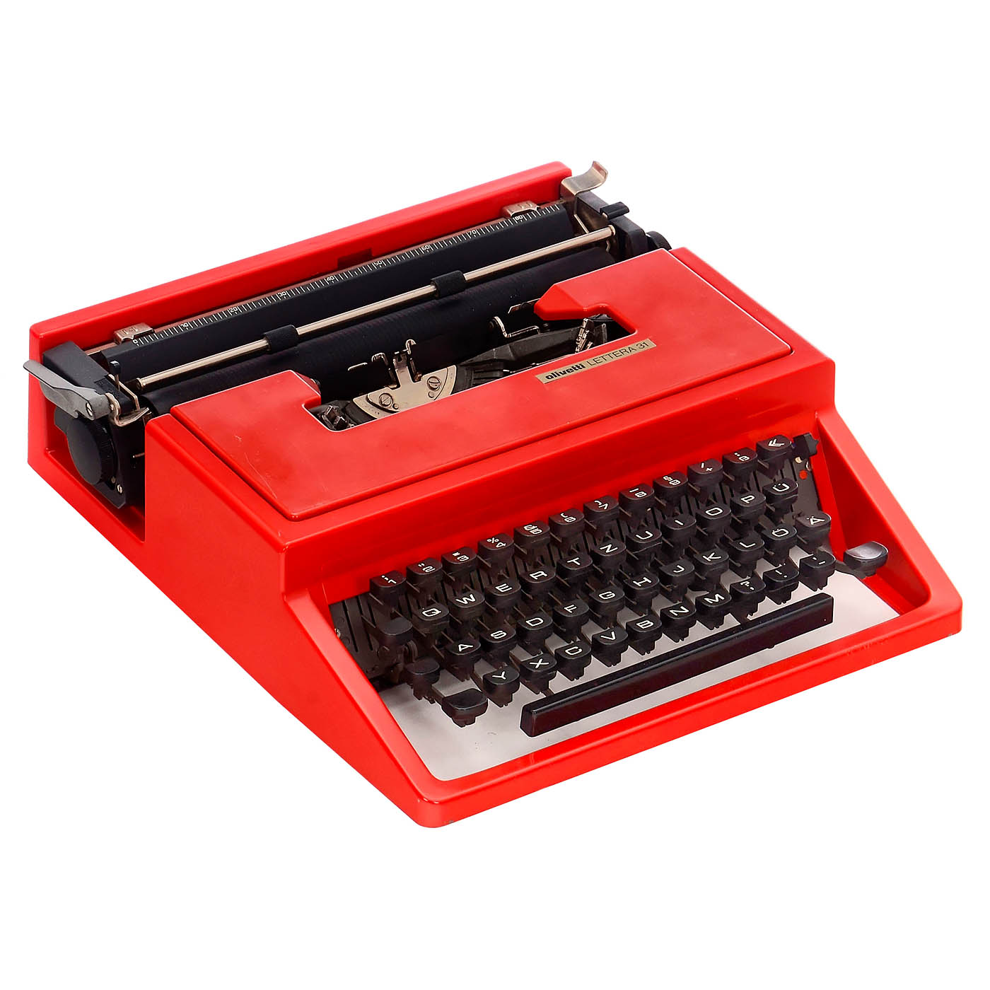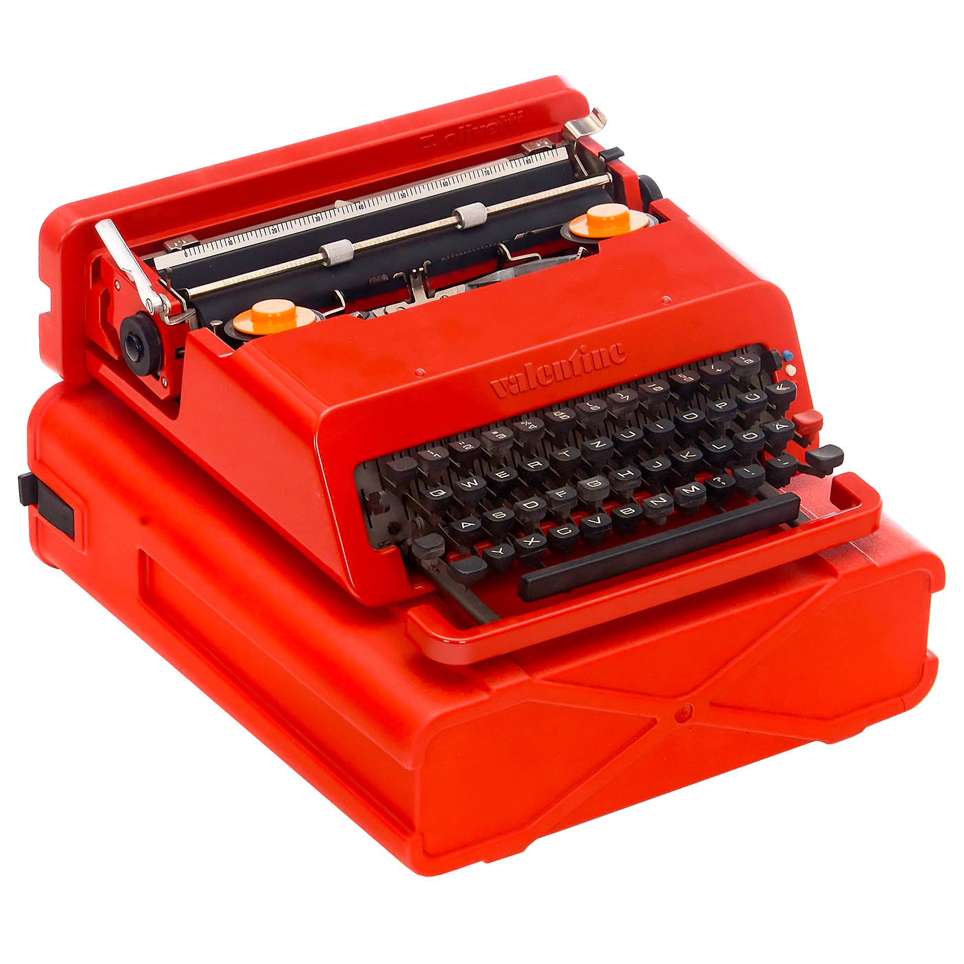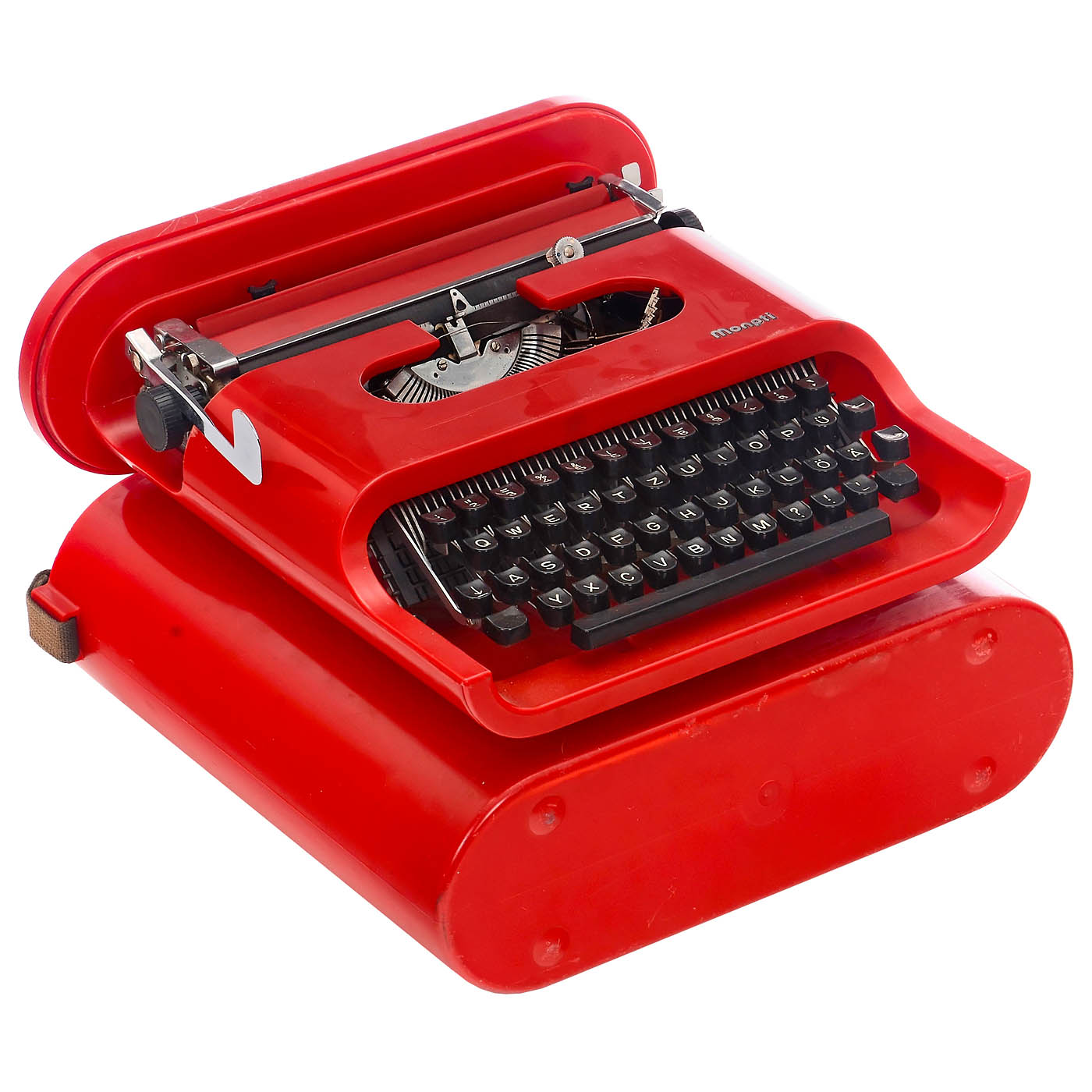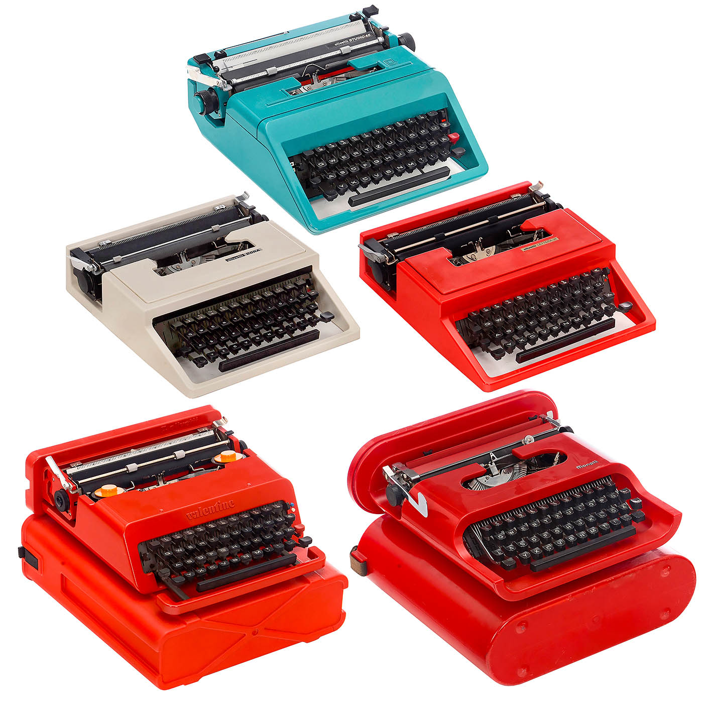 1) Monpti, 1968, Zbrojovka Brno NP in Vy?kov, Czechoslovakia, invented by industrial designer Stefan Lengyel, sold in Karstadt department stores, 4-row keyboard, double switch, rounded red plastic casing, the machine slides into the casing like a drawer, an extraordinary model designed one year before the famous Valentine. – 2) Valentine, 1969, Olivetti, Italy, legendary plastic typewriter designed by Ettore Sottsass and Perry A. King, with case. – 3) Studio 45, c. 1970, Olivetti, turquoise. – 4) Lettera 31, c. 1970, Olivetti, red. – And: 5) Dora, c. 1975, Olivetti, white. – Emblematic examples of classic industrial design!
