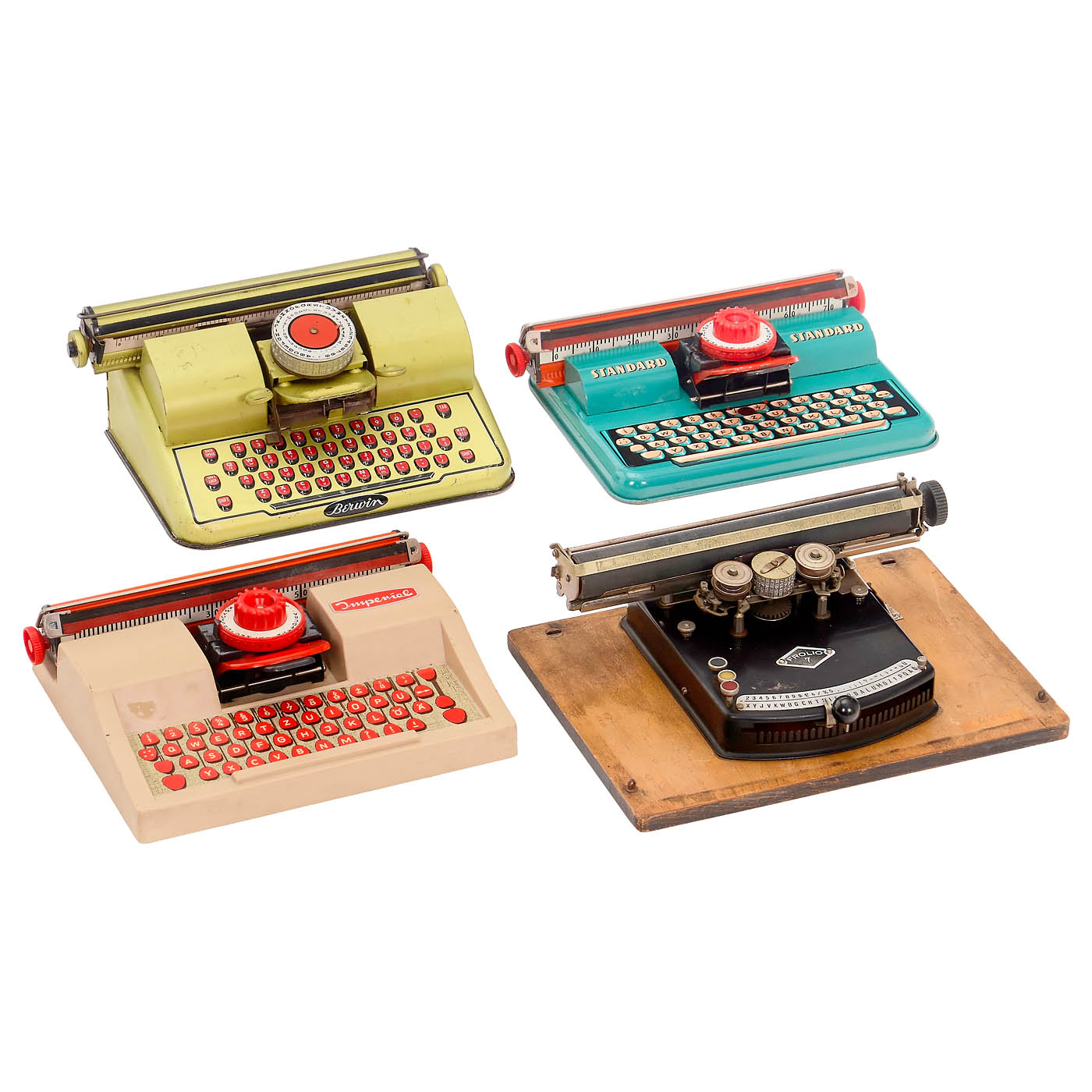 1) "Gundka Mod. 5", 1924 onwards, German typewheel machine, with tin cover, no. 60354. – 2) "Frolio 7", c. 1925, Gundka-Werk, index typewheel machine, made for the Italian market, no. 76934. – 3) Bing No. 2, c. 1930, model with ink ribbon, on tin base with cover. – 4) Bing, Nuremberg, rare white version, French keyboard. – 5) Standard typewriter, c. 1970, Tipp & Co, Germany, lithographed tin. – 6) Berwin Gold, USA, 1950s, lithographed tin. – And: 7) 4 different models with plastic cases: "Imperial", "Julietta" (with crack), "Mettey" and "Tomy's Tutor Typer".