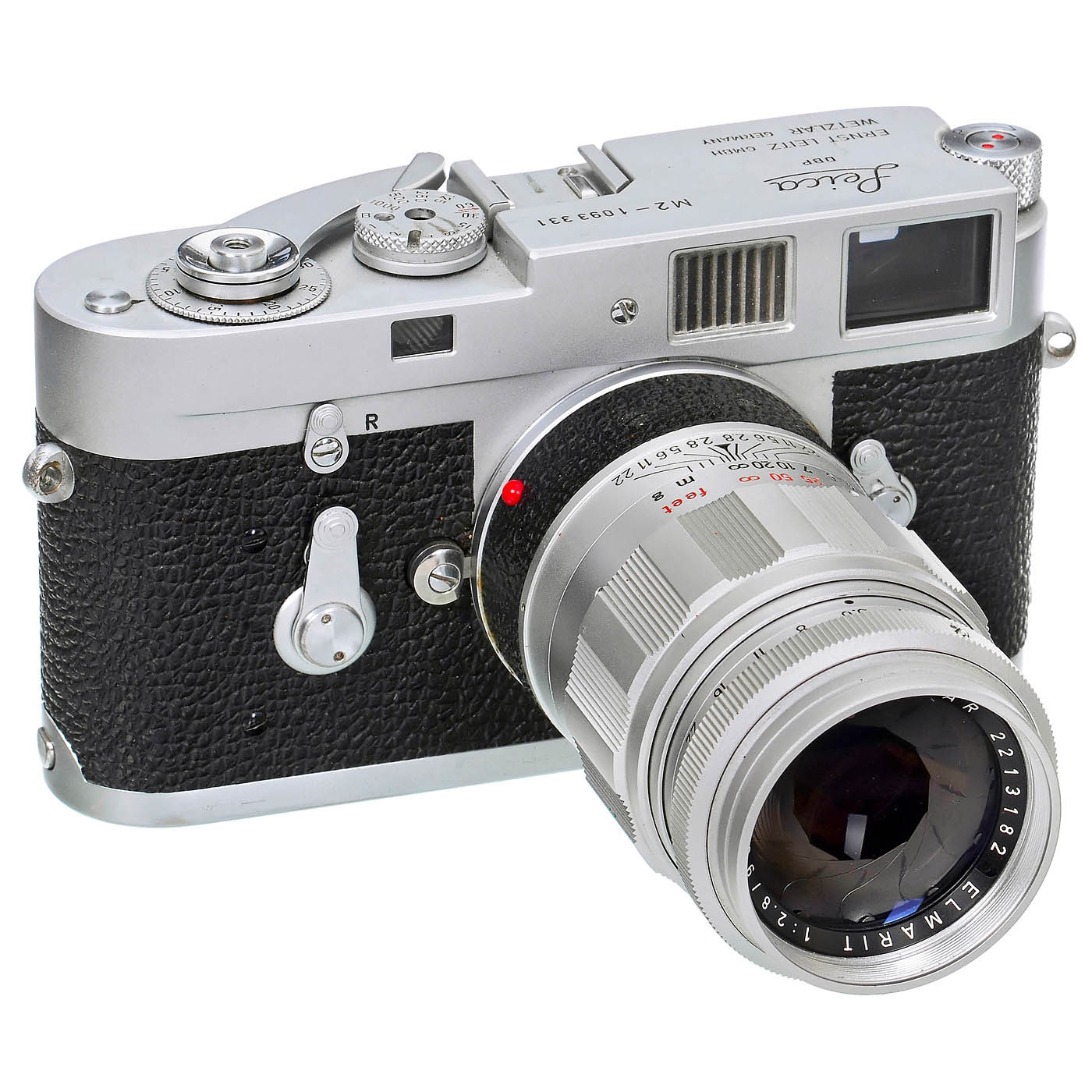 Leitz, Wetzlar. 1) Leica M2, no. 1093331, rangefinder accurate, shutter lags by about 2 mm at long exposure times from 1/15 onwards, bottom plate and lugs show wear. (3/3) – And: 2) Elmarit M 2.8/90 mm, no. 2213182, glass clean under point light. (3/2-)