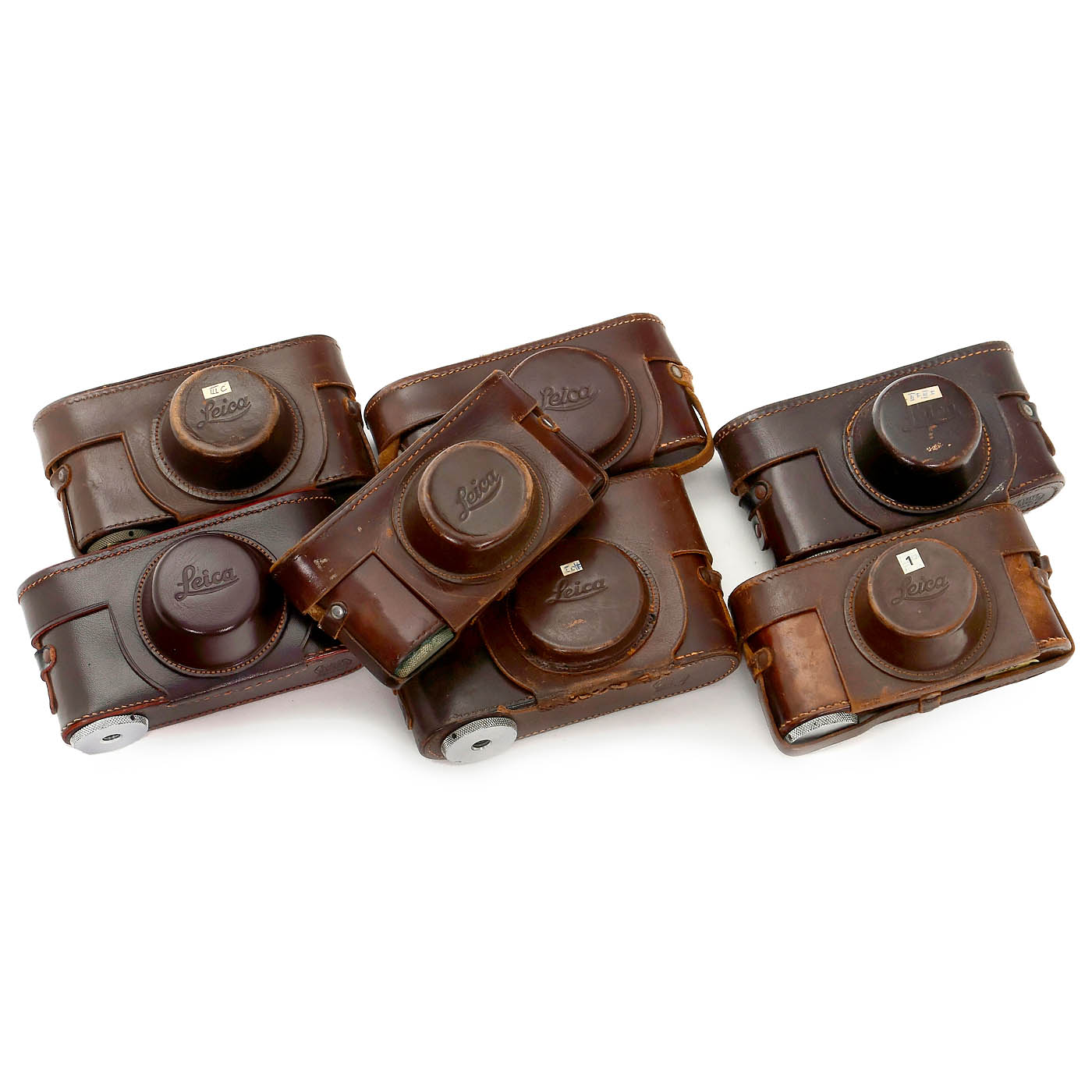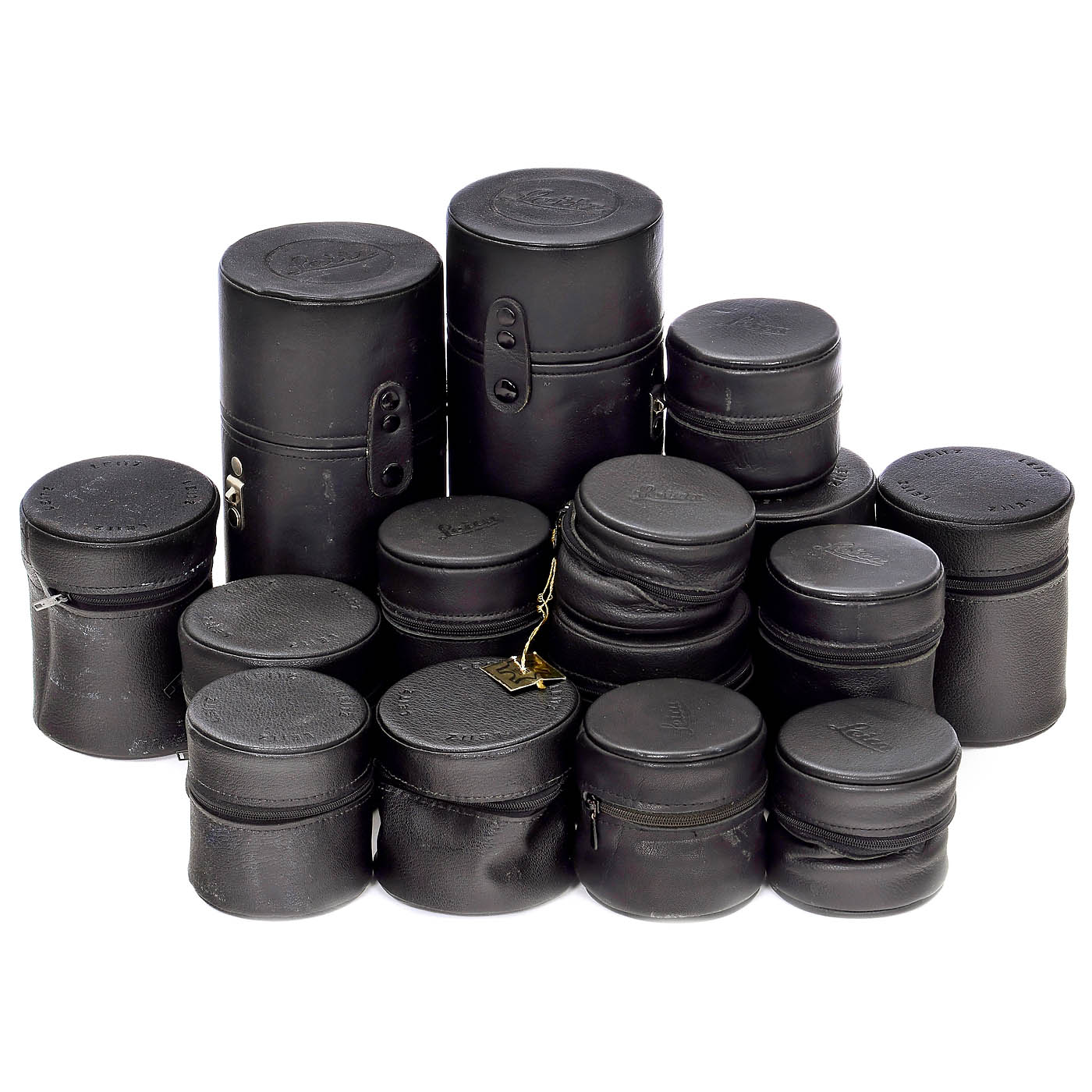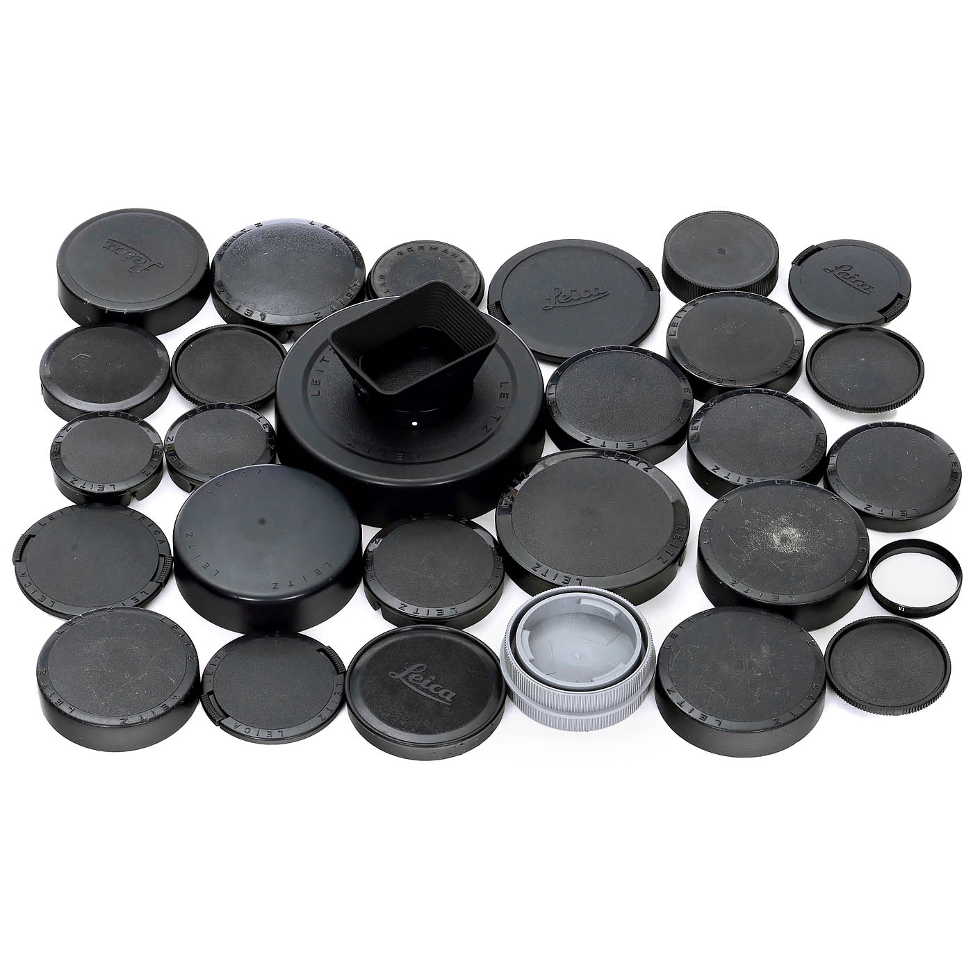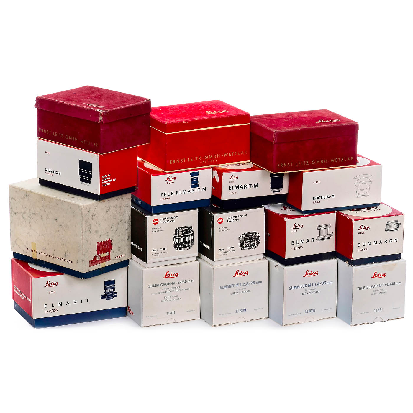 Leitz, Wetzlar/Canada. 1–3) Early velvet boxes for Leica IIf, IIIf, and a rare light red one for the IIIg. – 4–12) Early boxes for Leica-M lenses, including those for the Noctilux 1/50 mm and Summilux 1.4/75 mm. – 13–16) Additional boxes for M-lenses. – 17–23) Leitz leather pouches for screw-mount Leicas, including a near-mint one for the Leica IIIg. – 24–38) Leather lens pouches ranging from 6.5 cm to 25 cm in height, mostly for Leicaflex/Leica-R lenses. – 39) 26 Leica/Leitz lens caps from 51 to 125 mm diameter for R-lenses, also including some body caps. – And: 40) Lens hood 12509 for the R 2.8/35 mm, R-lens coupling ring, and 14160 filter ring. – A great opportunity to enhance your Leica collection!