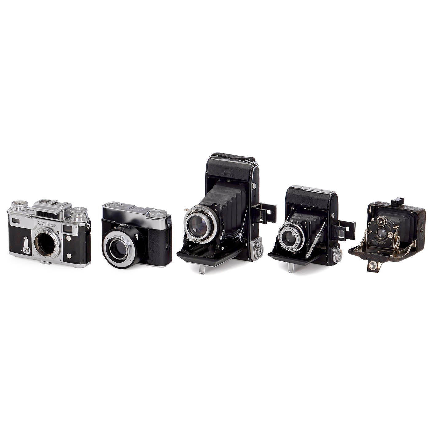 Zeiss Ikon, Dresden and Stuttgart. 1–6) 6 well-preserved movie cameras from the Movikon 16 onwards, all 6 motors running. – 7–21) 15 cameras. From the Atom, Cocarette, Contax II and III, Donata, Ercona, Ikonta, Miroflex, Nettar to the microscope camera; all in varying condition, some in mint condition. – And: 22–50) 3 main catalogs from 1927, 1929 and 1934, brochures, reference books, various Zeiss Ikon magazines "Phototechnik" 1927–1938, as well as Zeiss Oberkochen brochures.