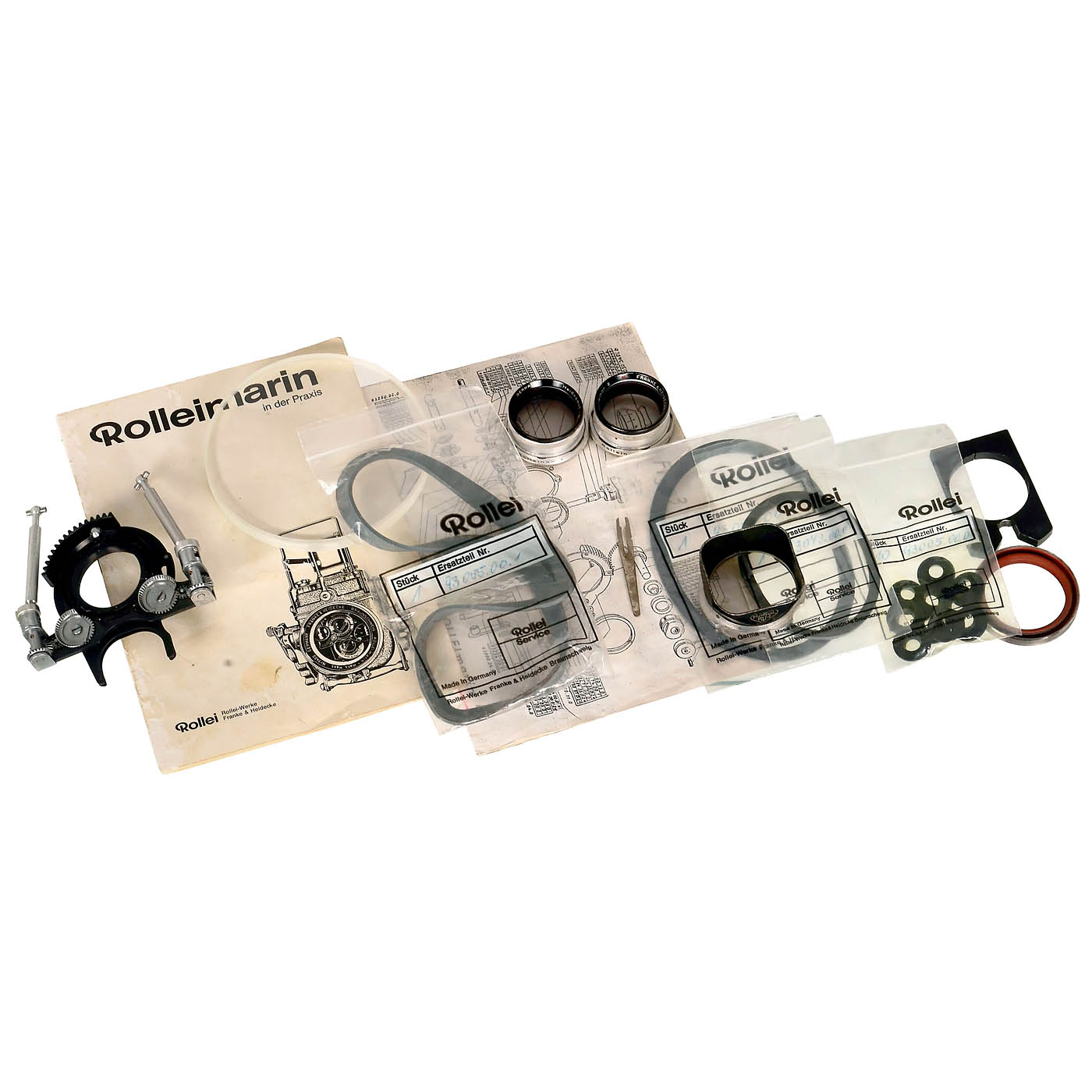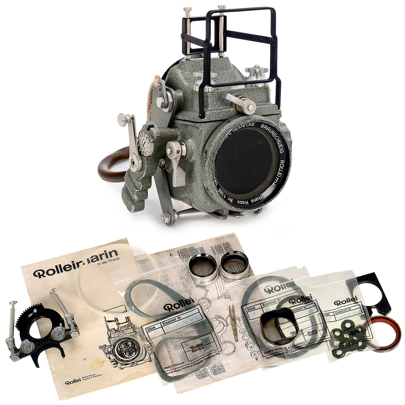 Franke & Heidecke, Braunschweig. Rolleimarin Hans Hass no. 1165, for Rolleiflex 3.5 C 1740000–1868999, opened, with German instructions, spare parts lists (copies for Rolleimarin III and IV), the important coupling piece 3 with bayonet size II, 4 Rollei spare parts bags with 13 original sealing rings, spare front glass, Rolleimarin 1 and 2, and small accessories. Thanks to good lubrication (as recommended in the instructions), preserved without signs of corrosion, mechanism functions, but not tested for leaks in the local river Rhine.