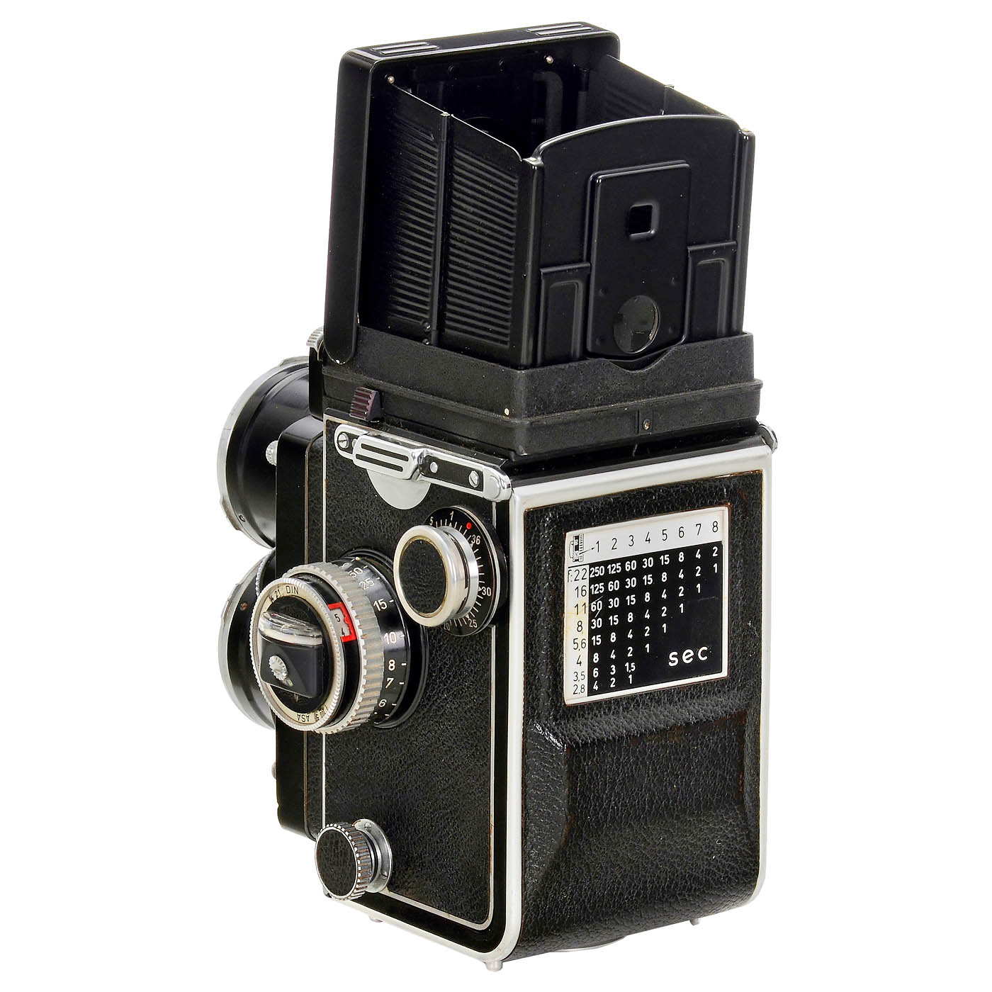 Franke & Heidecke, Braunschweig. no. S 2301488, first version with flat glass! Sonnar 4/135 mm, no. 2690551, glass clean under point light, shutter, self release and exposure meter working, sign of use on filter holder for viewfinder-lens, with Rolleikin counter and cap. In good condition and a fully working camera for the user!