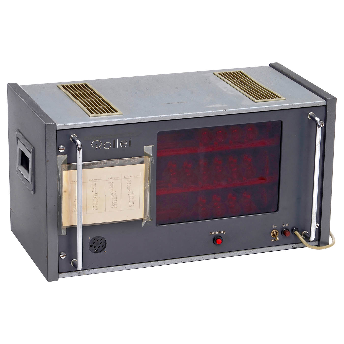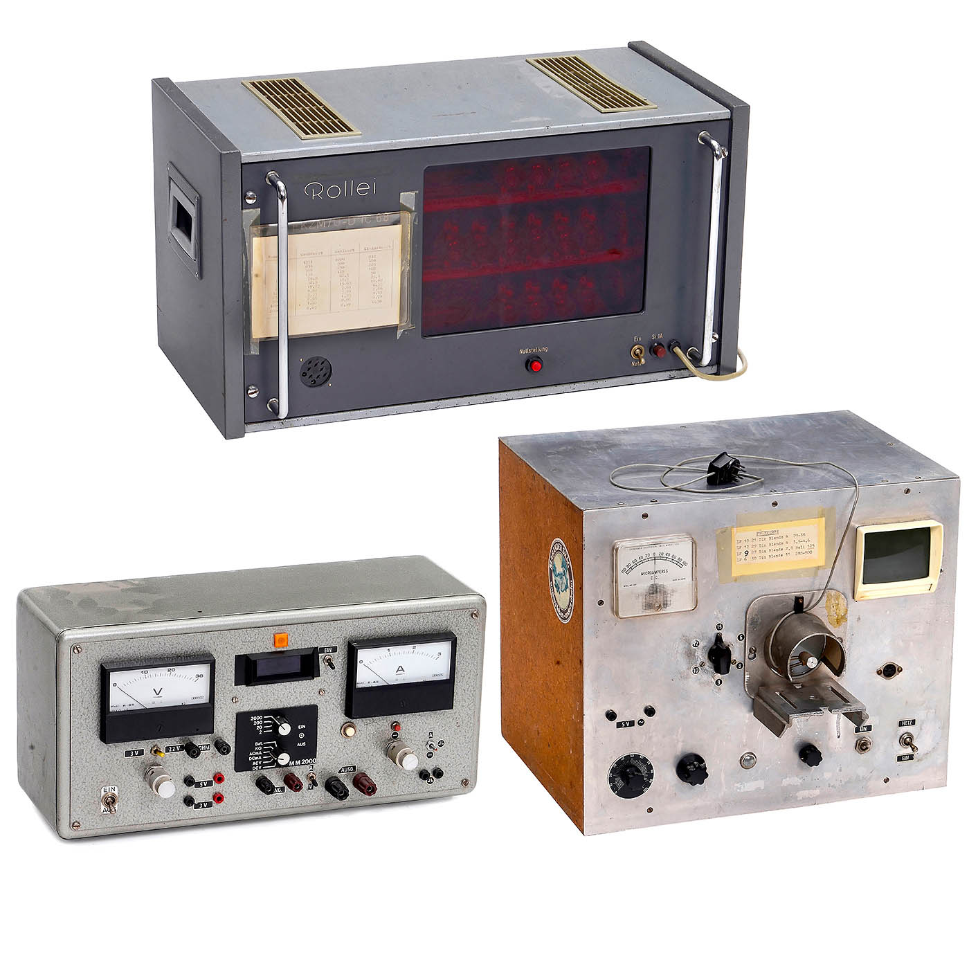 Rollei, Braunschweig. 1) Rollei camera exposure meter tester type EKZM/U-D IC 68, dimensions 56 x 30 x 27 cm. This enabled Singapore to begin its journey to becoming a high-tech center. – And: 2–3) Two other instruments from Rollei production during this period. – Electrical functions not tested. Rare exhibition material on the history of the German camera industry. Something special for a Rollei collection!