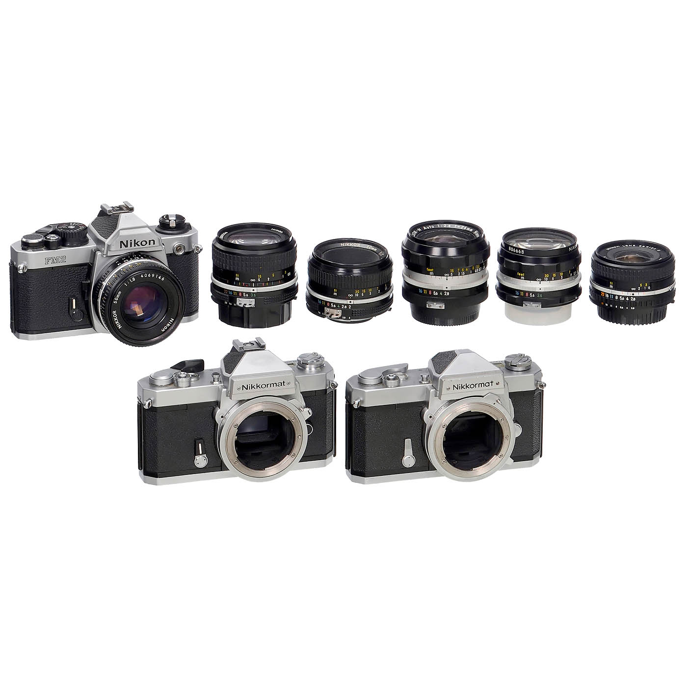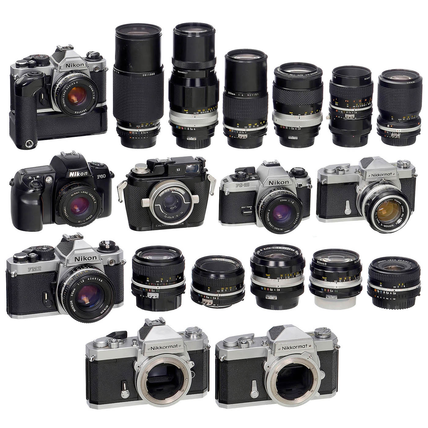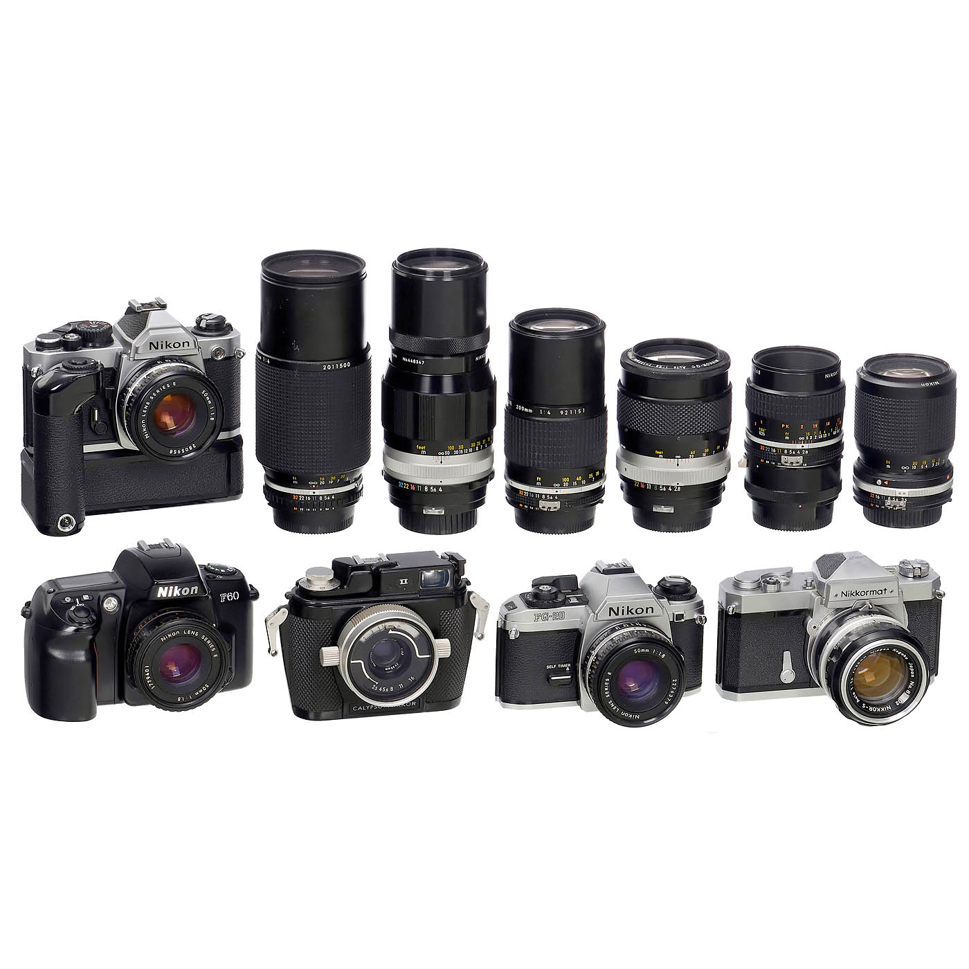 Nikon, Japan. Lenses good to clean under point light, without cleaning marks. 1) Nikon FM2 last version (1/250 with flash), Nikkor 1.8/50 mm pancake. (3/2) – 2) Nikon FM2 with Nikon Series E 1.8/50 mm. (3+/2) – 3) Motor MD-12. (3+/3+) – 4) Nikon FG-20, shutter working, automatic non-functional, Series E 1.8/50 mm. (3/–) – 5) Nikon F60, Series E 1.8/50 mm first version, untested. (3/–) – 6) Nikkormat FT-2, with a significant dent below the film advance lever, Nikkor 2/50 mm AI. (3-/3) – 7) Nikkormat FTn, a notch near the rewind crank, Nikkor-S 1.4/50 mm. (3-/3) – 8) Nikkormat FTn body with minor dents. (3-/3) – 9) Calypso/Nikkor II with W-Nikkor 2.5/35 mm, O-rings intact, not tested underwater. (3/3) – 10) Nippon Kogaku Nikkor-N 2.8/24 mm. (3+/3) – 11) Nikon Series E 2.8/28 mm AI-S. (2-/3+) – 12) Nikkor 3.5/28 mm AI. (3+/3+) – 14) Micro-Nikkor 2.8/55 AI-S (some dust inside), with M2 extension tube (non-AI). (3+/3+) – 15) Nikkor-Q.C. 2.8/135 mm. (3+/3+) – 16) Early Nikkor 4/200 mm. (3/3) – 17) Nikkor 4/200 mm AI-S, last short MF version. (3/3) – 18) Zoom Nikkor 3.5–4.5/35–105 mm AI-S, sought-after push-pull zoom. (3+/3+) – And: 19) Nikon Series E Zoom 4/70–210 mm. (3/3)