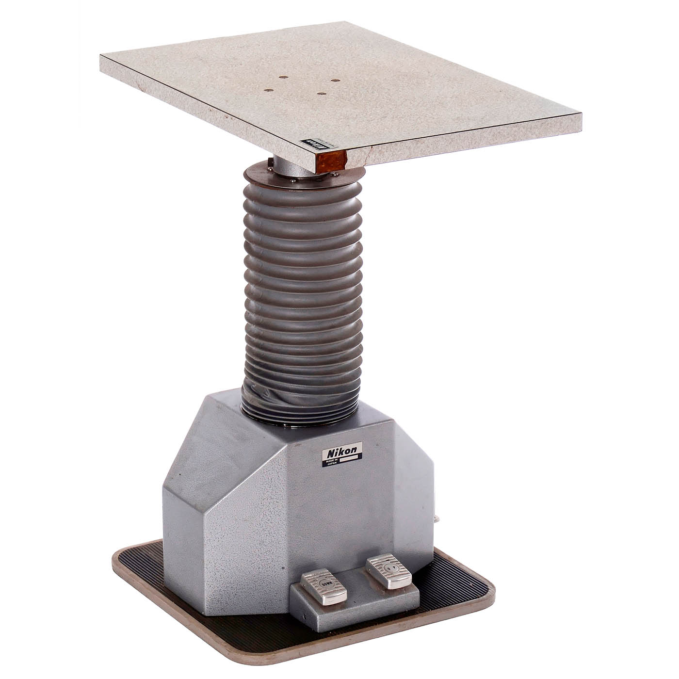 Nippon Kogaku K.K., Japan. Tabletop device, its electro-hydraulic Nikon base no. 53522 for raising and lowering is functional (at 220 V). The black lacquered ophthalmic examination device rests on a table with the serial no. 38626 (one corner of the table edge is missing its edge banding) and consists of a height-adjustable headrest with two knobs which the patient can hold in both hands. In front of this are two rotating arms, one above the other. The lower arm, serial no. 39499, is for the Nikon 7x–25x stereo zoom lens with the corresponding Nikon stereo binocular eyepieces. The upper arm, serial no. 65307, is for the beam splitter slot for collimating the image into the eye, with flash unit serial no. 54272 (untested). The zoom lens has two closely spaced ports, meaning that due to the limited space, only either the Nikon camera adapter or the microscope adapter can be mounted. Included are the Electronic Flash Device Power Unit Module MS-2 no. 55139 and an accessory box for small parts. Shipping is only available via freight carrier (camera for demonstration only). Optical components in clean condition. This beautifully designed device, with its extensive range of adjustment options, likely intended for a university eye clinic, is considerably rarer than any Nikon fundus camera.