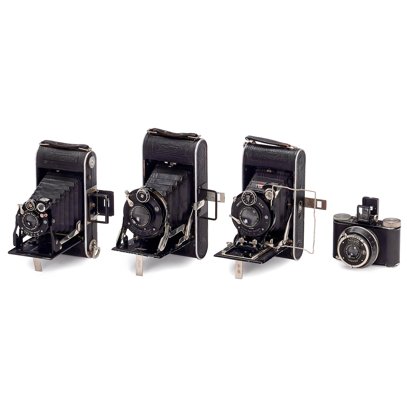 Nagel Camerawerk, Stuttgart. 1) Pupille, for 3 x 4 cm, Xenar 3.5/5 cm, Compur weak for long times. (3-/3) – 2–4) Vollenda 68 in 3 different versions with Radionar 6.3/10.5 cm or Nagel-Anast. 6.3/10.5 cm. (3/3) – 5) Nagel 74, export version, feet scale, Nagel Anastigmat 4.5/10.5 cm. (2-/3+) – 6) Librette 79, Nagel-Anastigmat 6.3/12 cm. (2-/3) – 7) Vollenda 70/0, one spread with damage. (3/3-) – And: 8) Vollenda 3 x 4 cm, Radionar 3.5/5 cm, Compur is running. (4/3+)