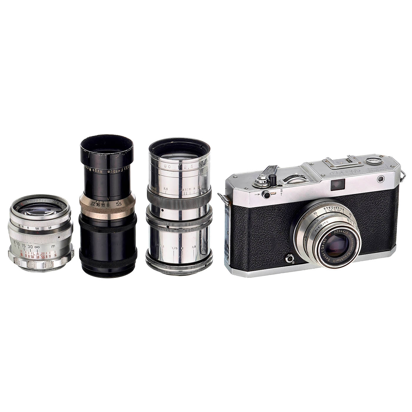 Gebr. Wenk, Nuremberg. Body no. 5880, format 24 x 30 mm on 35mm film, early version without 24 x 30 engraving, interchangeable Xenar 2.8/50 mm lens no. 2294429 (M40), coupled rangefinder with parallax compensation and metal focal-plane shutter. Z and 1/25–1/800 sec. speeds function well, rapid film advance lever, shutter release lock, one decorative screw replaced. Rare and sought-after, as production ceased after only six months in 1952. (3+/2-) – In addition: The previous owner once tried to acquire or adapt interchangeable lenses; the following can be attached: Tele Megor 5.5/180 mm (with some extension only infinity), Angenieux 2.5/90 mm (iris missing, an inner lens was reversed to achieve suitable focus with reduced quality) and Roeschlein Telenar 3.8/90 mm, which reaches infinity at maximum extension.