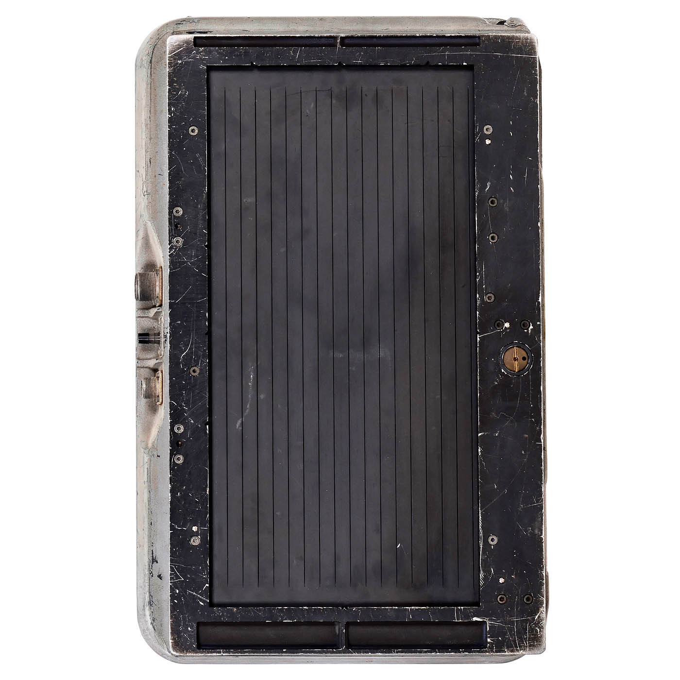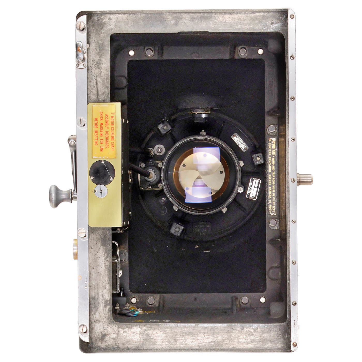 Fairchild Camera and Industry Corp., Syosset, N.Y. K-38 reconnaissance camera, serial no. 54-492, for 23 x 46 cm on aerial film, consisting of camera body, cone with lens, and film magazine. Mechanism and lens are in correct working order. Electrical components are untested (28 V/6 A). Dimensions with magazine: 100 x 54 x 35 cm. Camera: The shutter cocking mechanism (crank) and release, as well as the optical shutter, function (the loud bang is original). Camera counter reads 09329. Optical cone: "Lens Cone 36 inch for K-38 Camera", with Bell & Howell, Chicago Type I 8/36 inch (923 mm) Telephoto lens, serial no. 3207, yellow dot for coating, movable aperture, testing with a point light not possible, but front and rear lens groups clean when illuminated with a point light. Magazine: Ryan Industries Inc., Detroit. Magazine Film Aircraft Camera Type A-8B MIL-M-1421 B, serial no. AF-53-4327, film suction plate with heating element, both rubber rollers clean and grippy. – Camera was in active use, clear signs of wear; this type of camera is also said to have been on board U-2 flights (U-2 still in service until 2022, for example over Ukraine). An impressive exhibit for any aviation and military museum – as for aerial reconnaissance, the aircraft were built around the cameras, not the other way around!