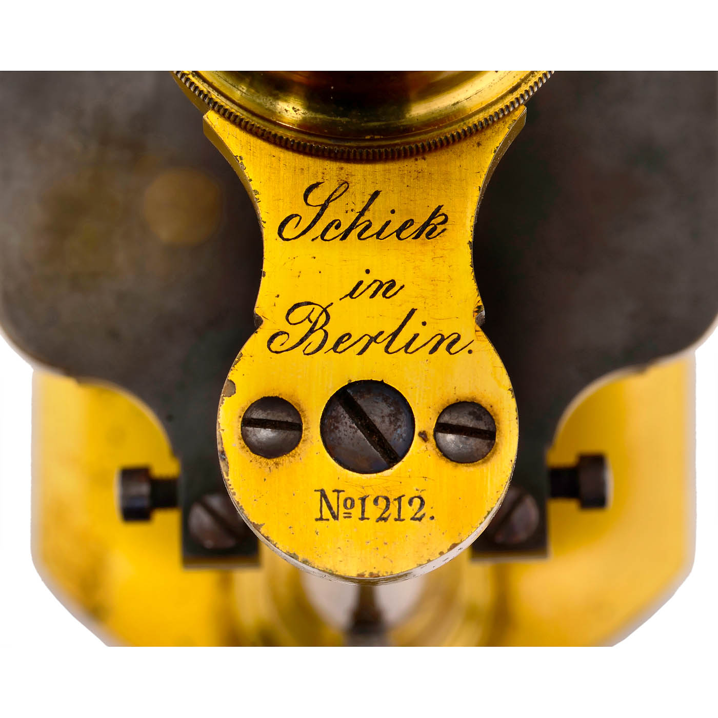 Signed on the column "Schiek in Berlin No. 1212", original lacquered brass, 3 eyepieces (nos. 0, 1 and 2), one combination objective lens (no. 4), coarse adjustment by moving the tube, fine adjustment by asymmetrical tilting of the stage with the knurled screw on the column, pinhole aperture disc under the stage, multi-element double mirror on the base, 2 horn specimen holders (slightly damaged), height 10 ? in., in fitted mahogany case lined with brown velvet. – A rare microscope from a renowned Berlin manufacturer.