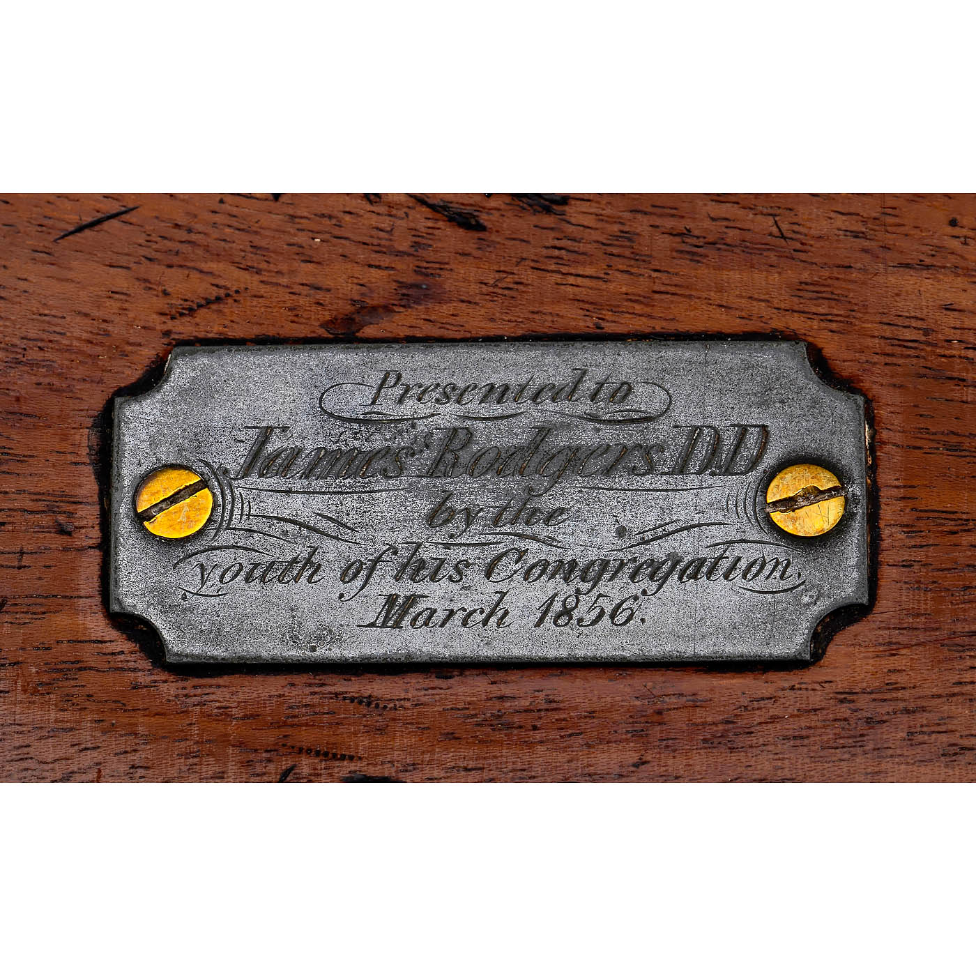 Attributed to the Parisian optician No?l Fran?ois Joseph Buron, signature on tube "Made for McAllister Co. Philadelphia", original lacquered brass, height when mounted on the box 14 in., box dimensions 10 ? x 6 x 3?? in., 1 lens, 1 eyepiece, substage pinhole aperture disc, mirror added, coarse and fine adjustment via a rack and pinion drive, mahogany box with a plaque reading "Presented to James Rodgers DD by the youth of his Congregation March 1856", drawer with removable tray.