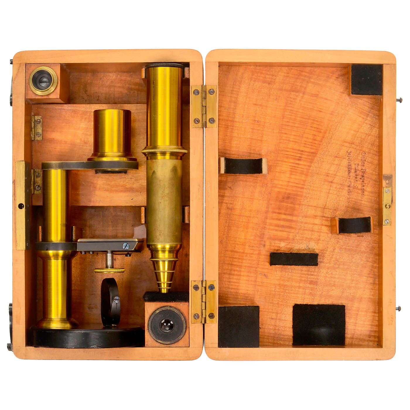 Signed on the bridge between the column and the tube "C. Kellner's Nachf. Fr. Belthle in Wetzlar No. 980", brass with black iron base, original lacquered and blackened, small tripod 4a by Belthle, height 10 ? in., two numbered objectives (nos. 1 and 3), two eyepieces (nos. 1 and 3, faintly legible), draw tube coarse adjustment, fine adjustment with the knurled screw on the side under the table, the table tilts asymmetrically to the side, pinhole aperture disc under the table, mechanically and optically very good condition (apparently little used, blued screws!), almost flawless zapon coating, the varnish on the base is also in excellent condition (well-preserved felt under the base), the box is made of light wood, partially lined with velvet on the inside, extremely beautiful and looks almost new, with lock and key. – An excellent and absolutely rare microscope in terms of type and condition!