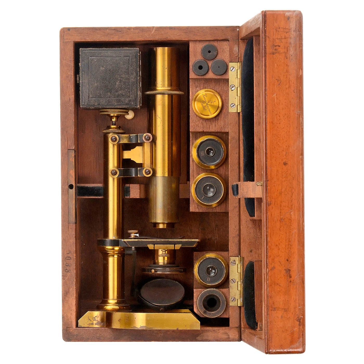 Tube signed "Seibert", original lacquered brass, lead-weighted horseshoe base, stamped serial no. 5033, double mirror, iris diaphragm and condenser lens in dovetail guide under the table, sliding tube, fine adjustment with knurled screw to the tube, height 11 ? in., with 3 eyepieces (nos. I, II and III) and 3 objective lenses (II, V and homogeneous immersion 1/12), in mahogany case with identical serial number.