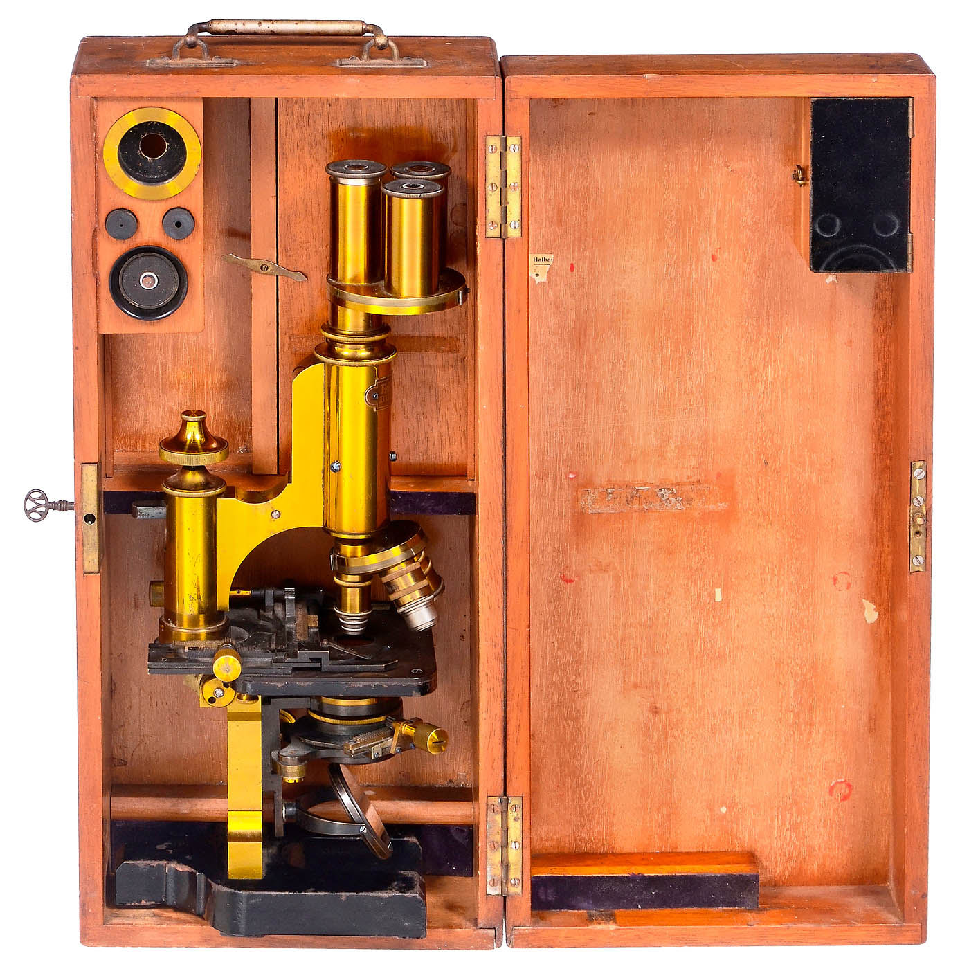 Signed on plaque on the tube "Ed. Messter, Berlin, N.W.", serial no. 31205, original lacquered brass, black-painted iron horseshoe base, triple eyepiece with the oculars no. 1, 3 and 4; triple nosepiece with 4, 7 and oil immersion objectives, micromillimetre-screw secures the fine adjustment, a lever under the micrometer-screw effects a raising or lowering of the tube, double mirror, condenser, adjustable iris diaphragm, and stage with ebonite cover, cross table, height closed 14 ? in. – A microscope of most unusual construction and size, very rare! With case.